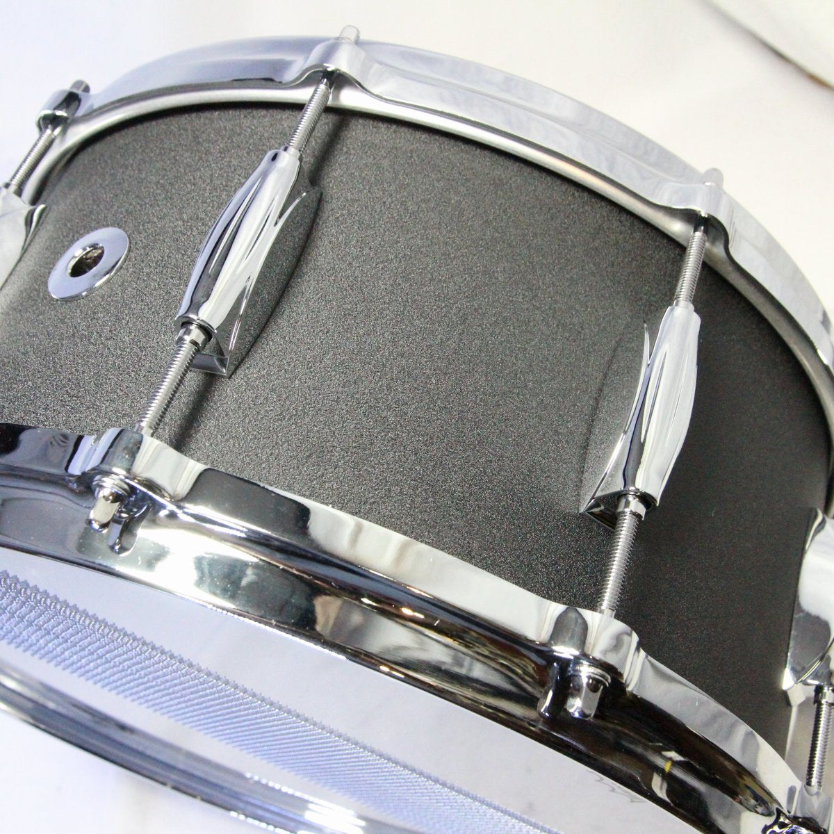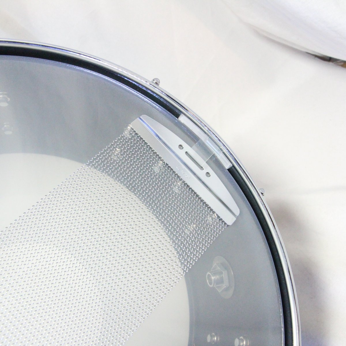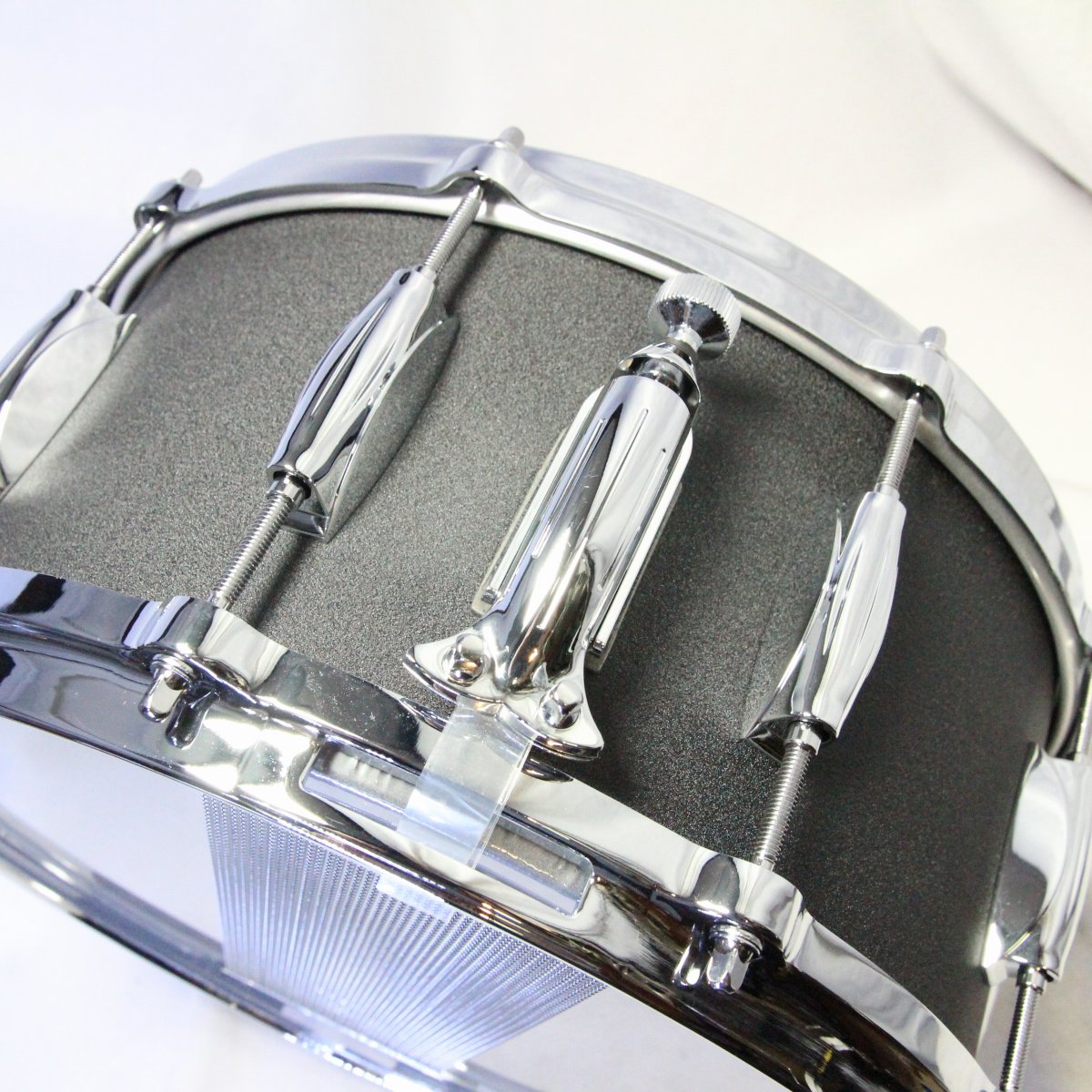 一般的にコパーシェルは金属胴の中でも比較的落ち着いたキャラクターで、木胴に近い感覚の音の丸みがありますが、このスネアは更にシェル両面へのパウダーコートによって、程よいブライトさを残しつつ倍音をちょうど良い量に整理し、マイクにも優しく豊かなサウンドを奏でます。