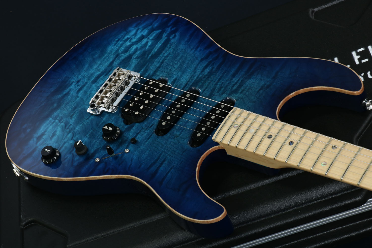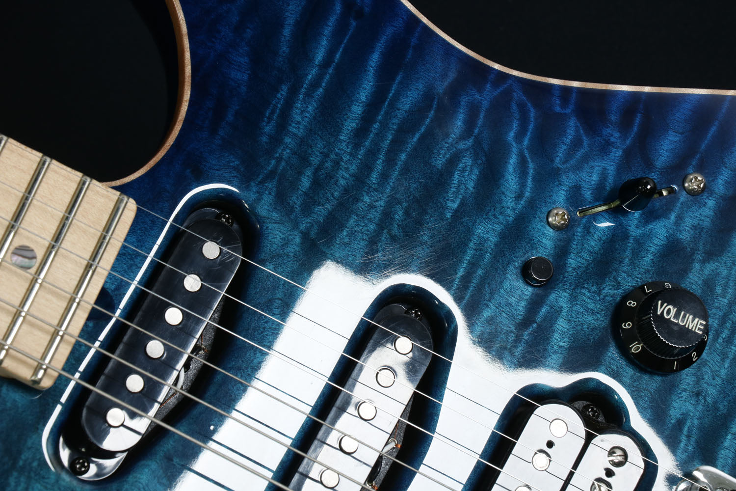 設計データから配線材、ネジ1本に至るまでUSA製のJames Tyler Guitarsと同じものを提供され、長野県松本市に在する飛鳥工場で作られる日本製James TylerはまさにUSA製にも負けない素晴らしいトーンを奏でます。本個体はキルトメイプルトップ、マムヨボディ、クォーターソウンのメイプルをネックと指板に採用。