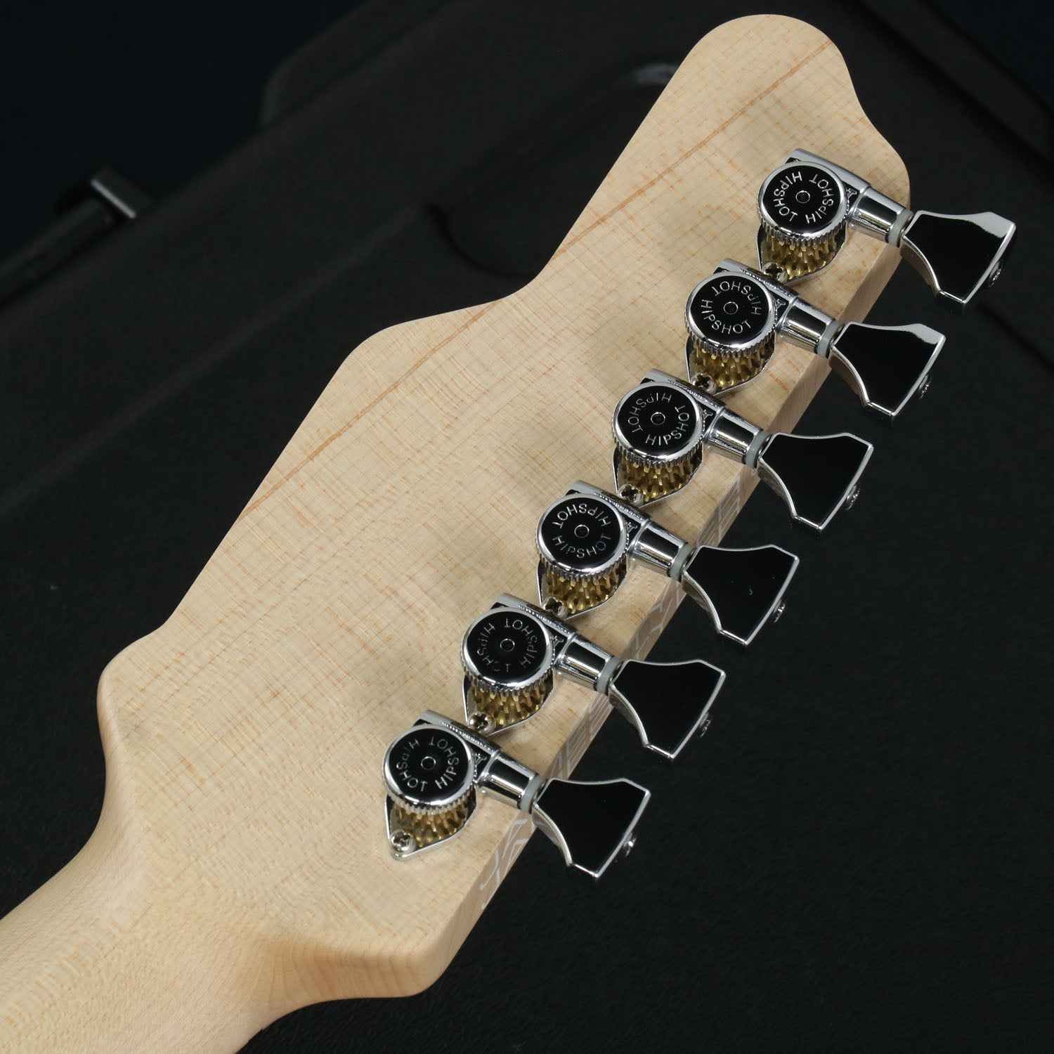 ネックシはサラサラとした質感のサテンフィニッシュが施されており、薄めのグリップ感でどんなプレイスタイルにもマッチするのは流石の一言です。ブリッジは多くのハイエンドブランドが信頼を置くGotoh製のベースプレートにタイラーの刻印入りプレスサドルを採用した『G2TS』を採用。またペグはHipshot製のLockingタイプを採用する事により、安定したチューニングと速やかな弦交換を可能としております。