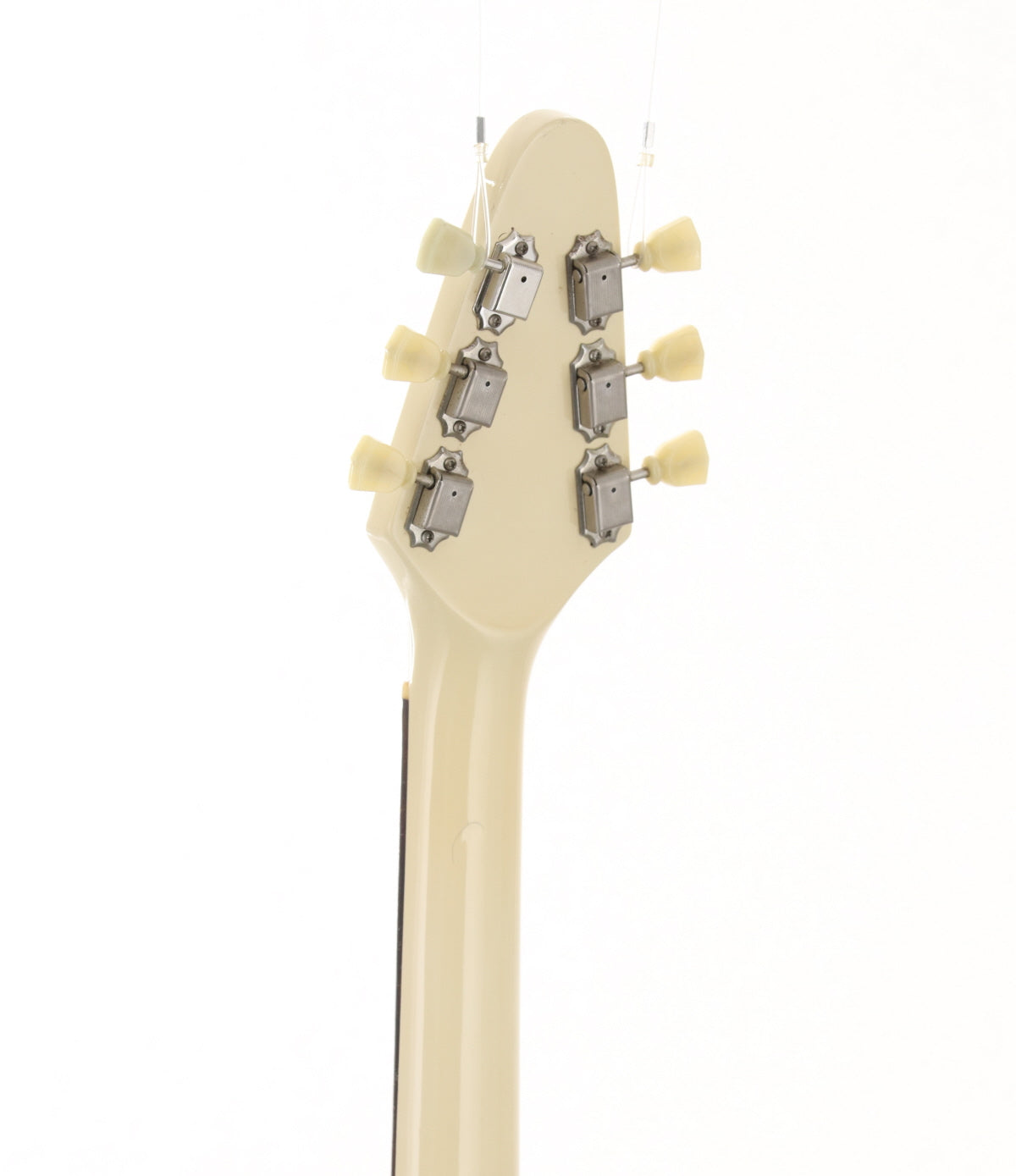 ボディ全体的にキズや打痕が多く、ボディの尖った先にて塗装剥がれが見られ、金属パーツにてくすみやピッツが目立ちます。