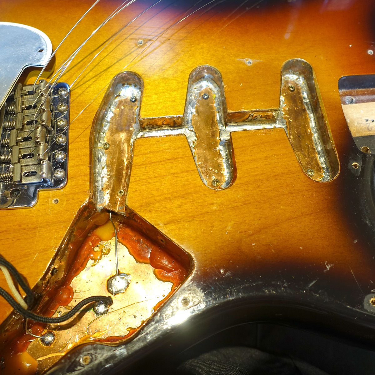 ピックガードにて弾きキズが見られ、ボディ裏のコントロールパネルのネジ穴にてヒビが生じ、金属パーツにてサビやくすみやピッツがございます。