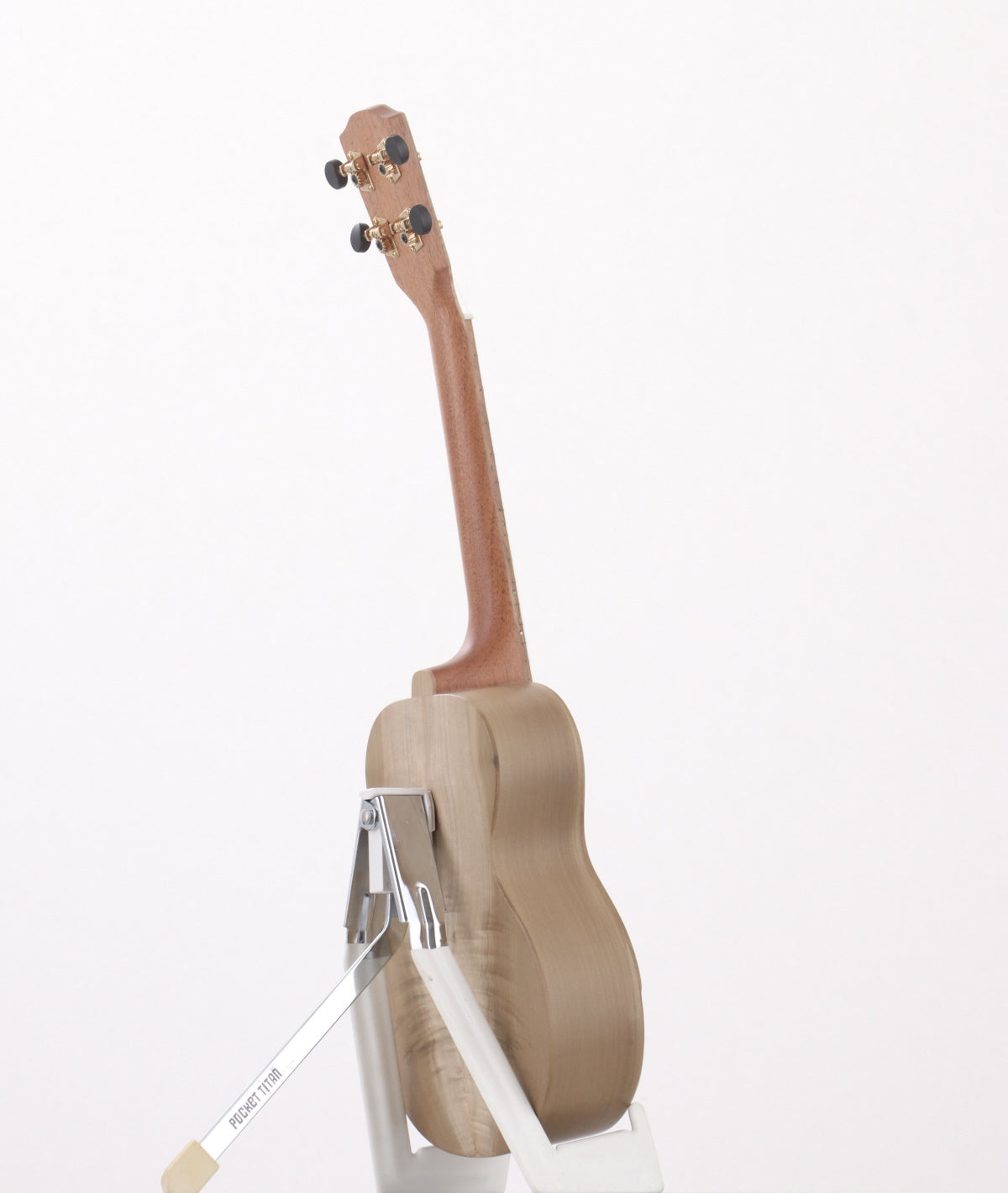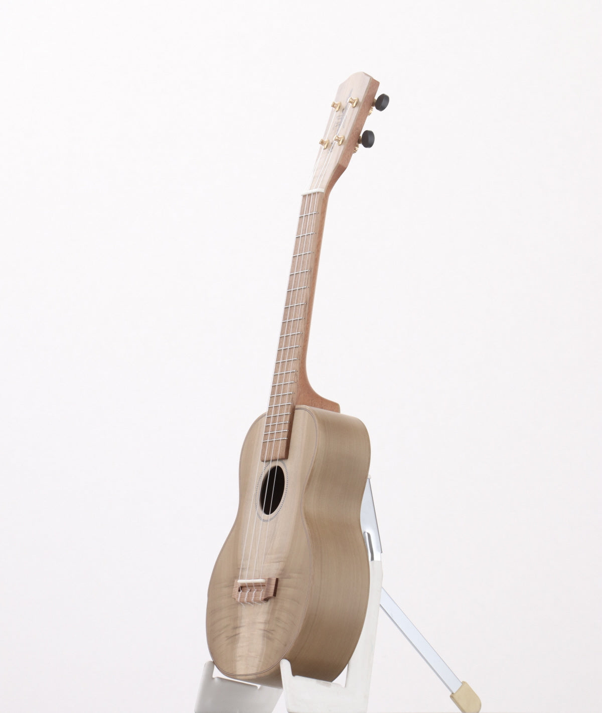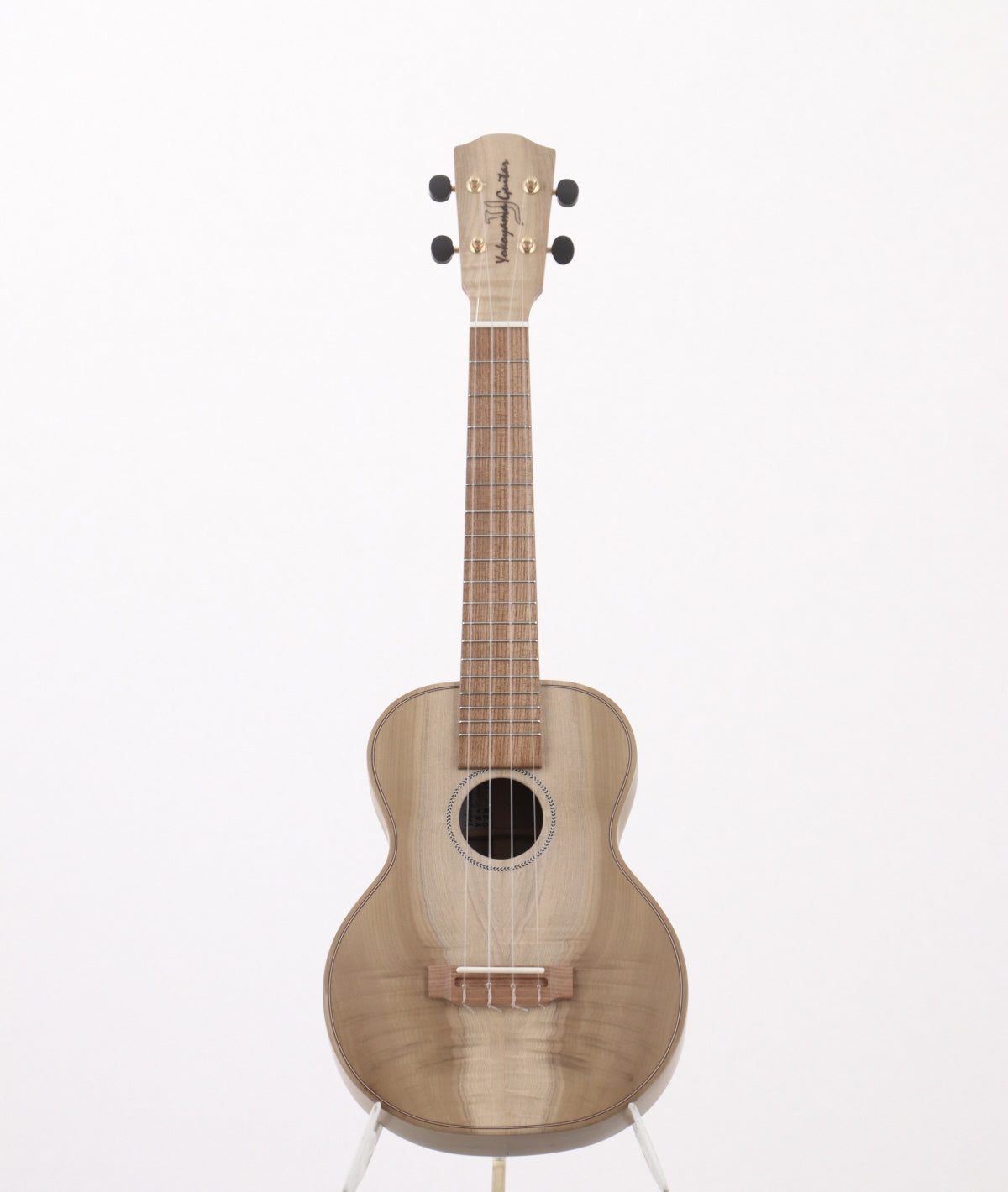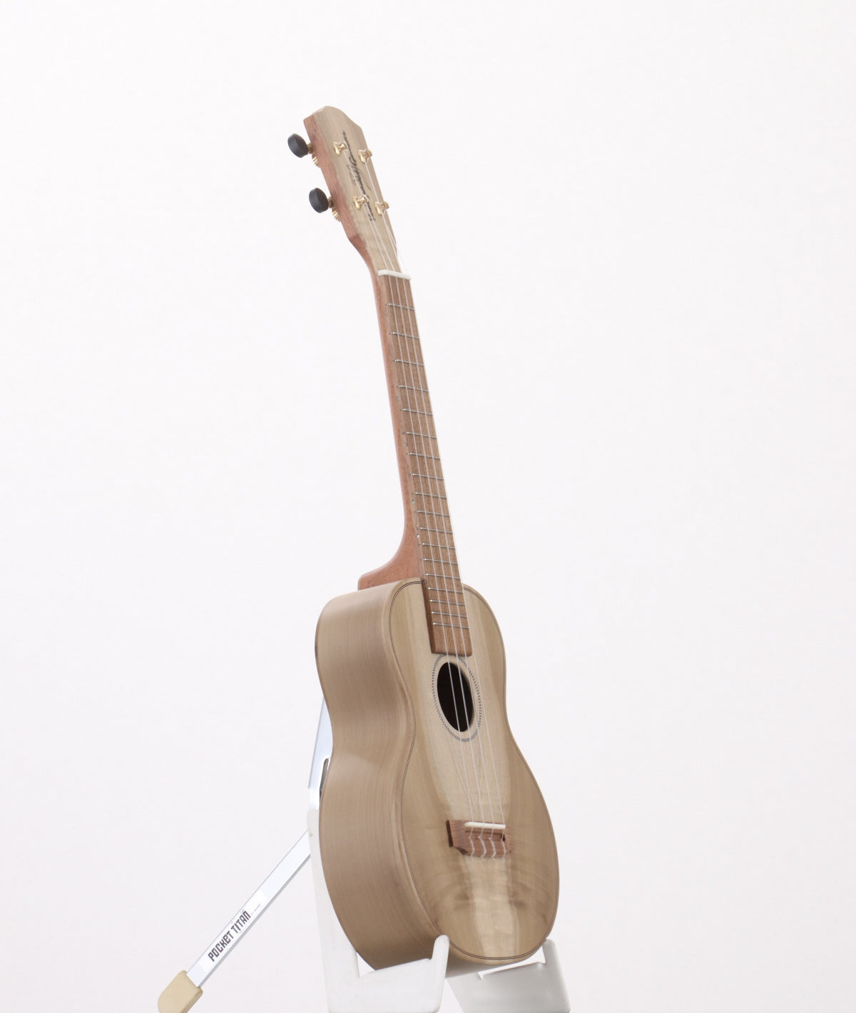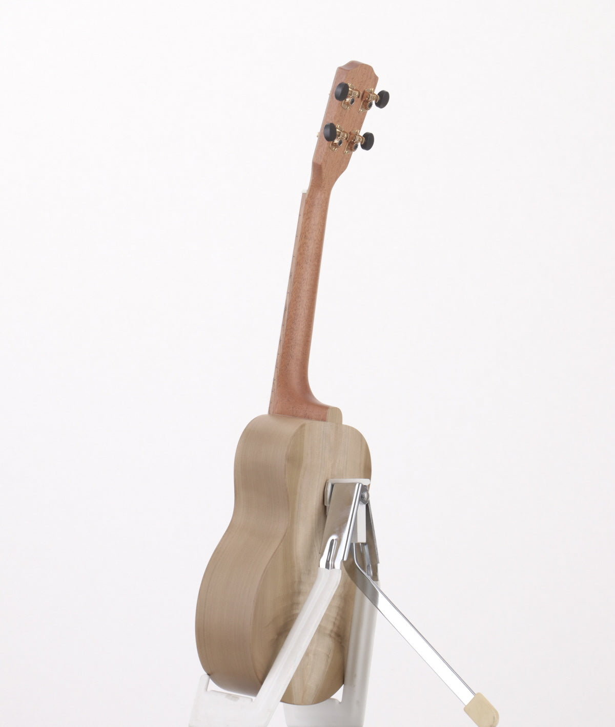 ボディは朴、ネックはマホガニー、指板とブリッジはパドック、スケールは約380mm、14フレットジョイント、ギアペグ仕様。