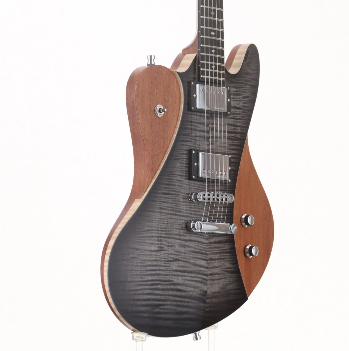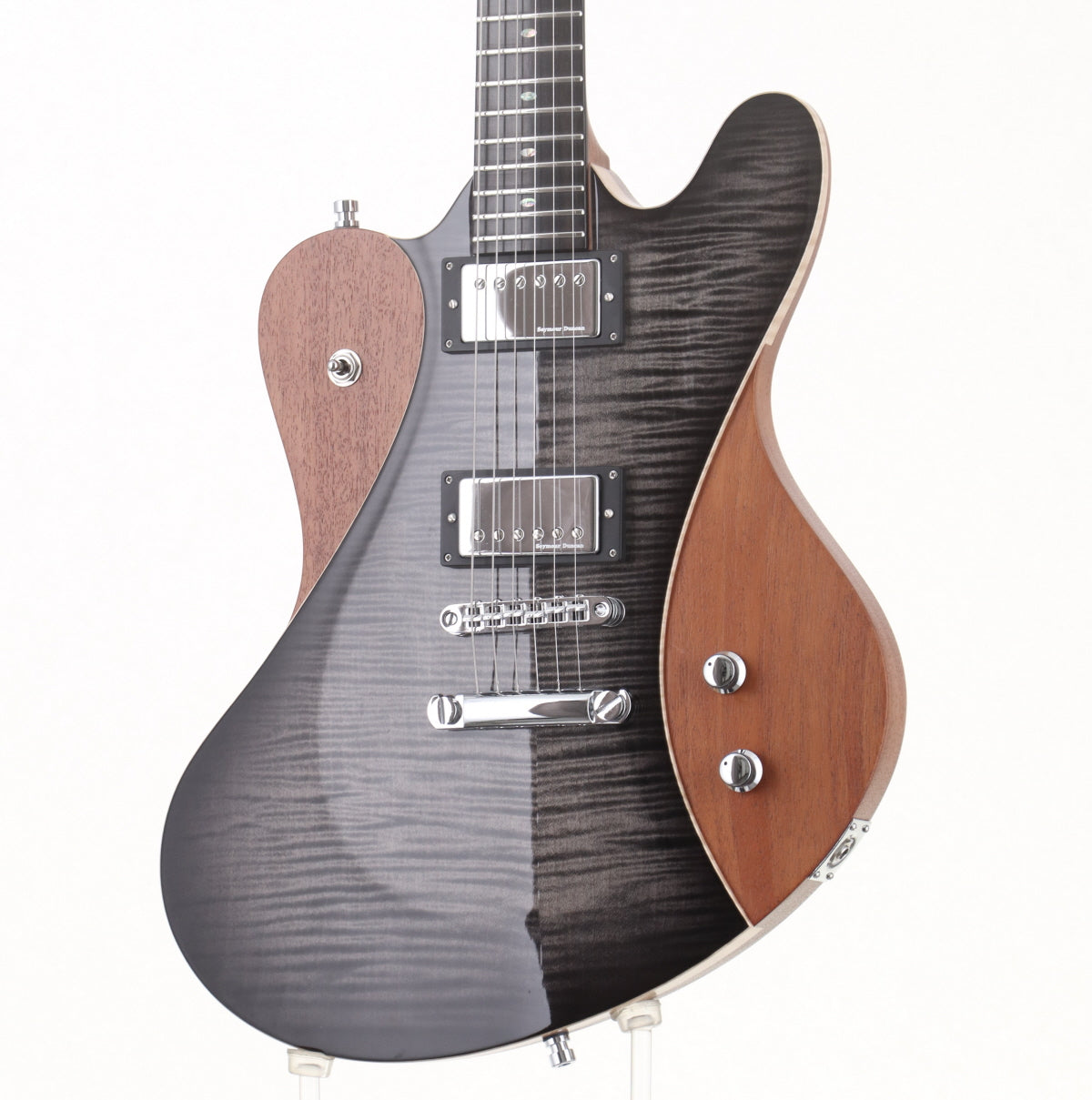 ボディはフレイムメイプル&マホガニー、ネックはマホガニー、指板はエボニー、ピックアップはフロントがSeymour Duncan SH-PG1 Pearly Gates、リアはSeymour Duncan SH-11 Custom Customを搭載。
