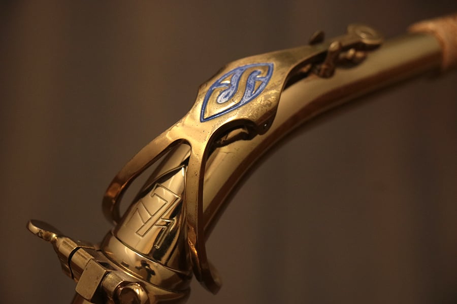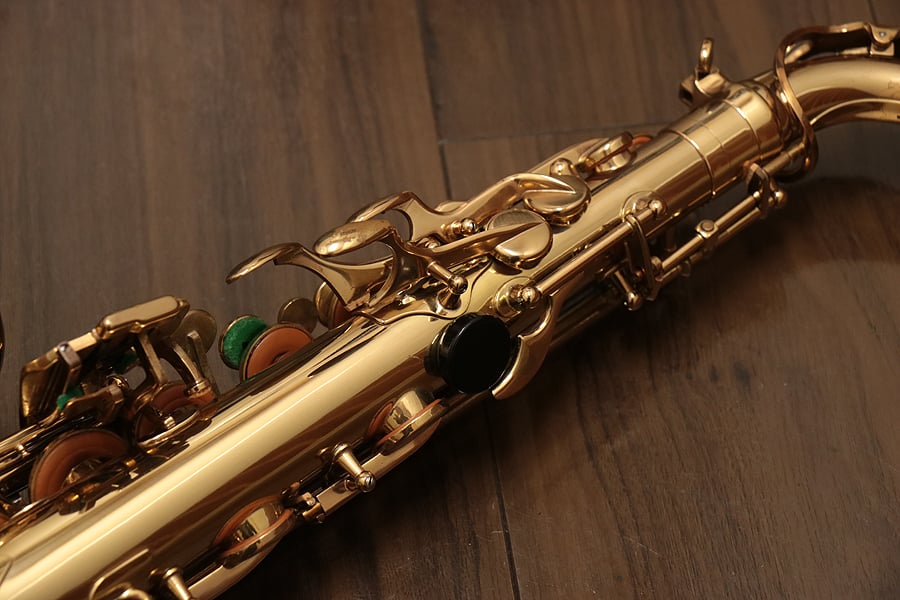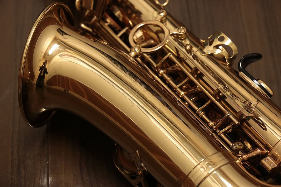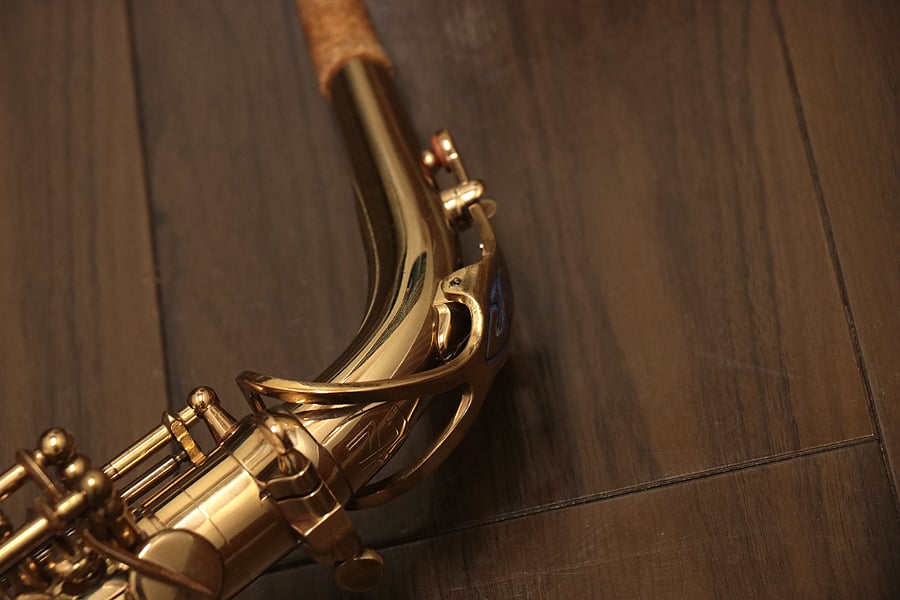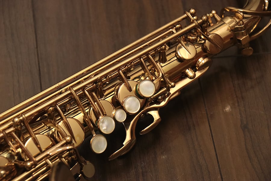 1980年頃製造のフランスセルマー・マーク7。約20年間製造されたマーク6からモデルチェンジを果たし、各キィパーツの大型化、管厚・管体設計を見直し、当時サックスに要求された更なるダイナミクスの拡大とパワフルなサウンドへと進化を遂げました。当時のジャズシーンもやはりアコースティックな編成からエレクトリック楽器が普及し始めた時代背景もあり、このマーク7はフュージョン・ロック・クロスオーバーといったミュージックシーンを支えた名器と言えます。