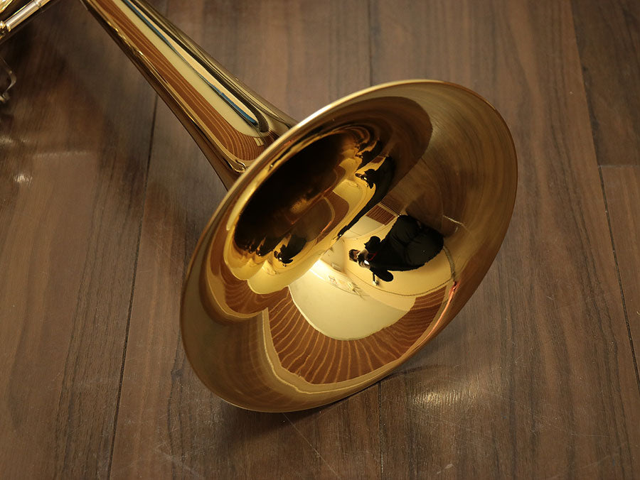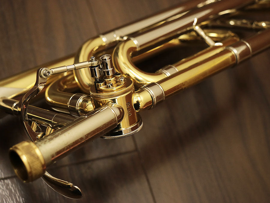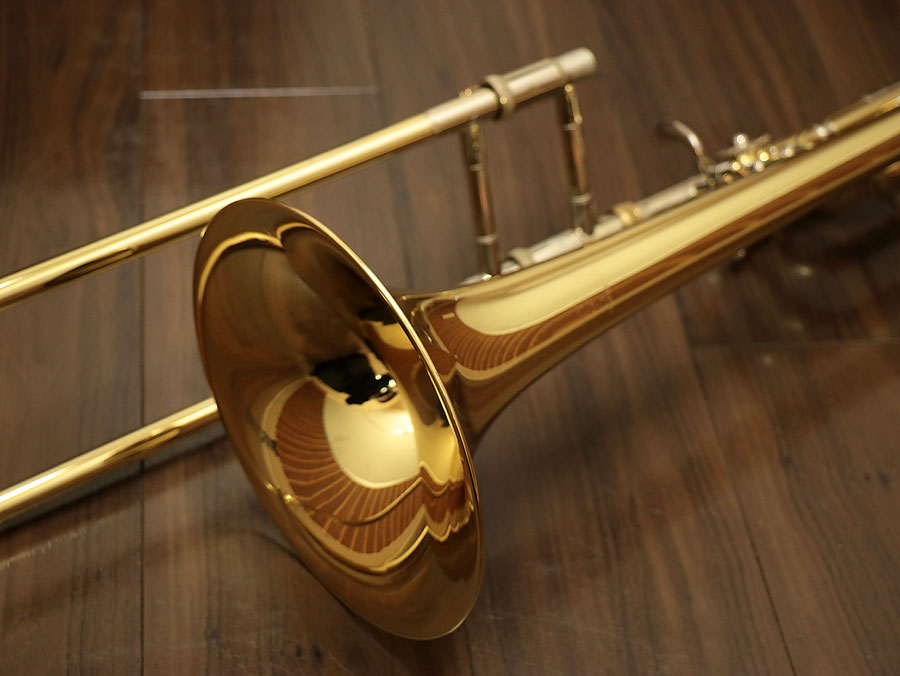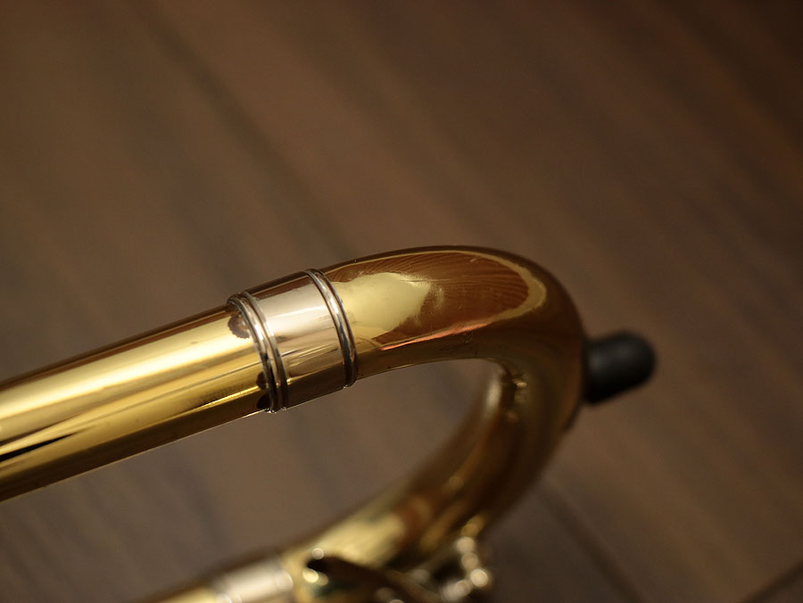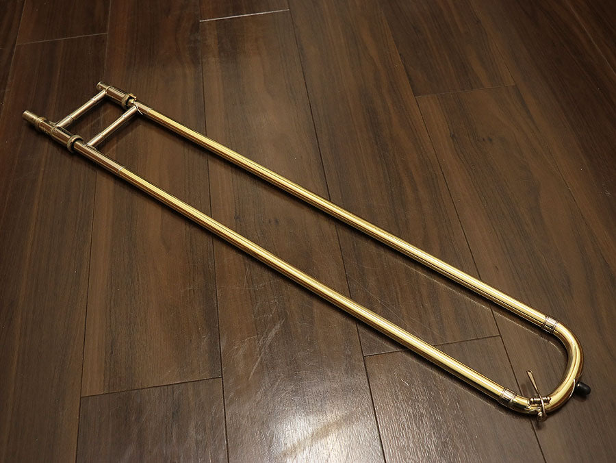 トロンボーンの王道ブランド・バックの太管テナーバストロンボーン。42シリーズのバリエーションは数多くありますが、こちらは最も一般的なトラディショナルラップ搭載・ラッカー仕上げのモデルです。吹奏楽、オーケストラ奏者を中心に圧倒的人気を誇るモデルです。全体的に使用キズ、ラッカー剥がれ。持ち手部を中心に使用感が目立ちます。溶接部やベル縁にサビの発生が目立ちます。スライドU字部、ベルフレアからベル管にかけて凹み修正跡が目立つなどよく使い込まれた印象です。