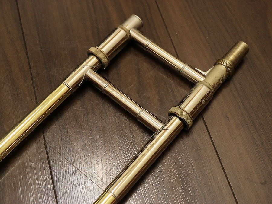 コンディション:全体的に使用キズ、ラッカー剥がれ。持ち手部を中心に使用感が目立ちます。溶接部やベル縁にサビの発生が目立ちます。スライドU字部、ベルフレアからベル管にかけて凹み修正跡が目立つなどよく使い込まれた印象です。