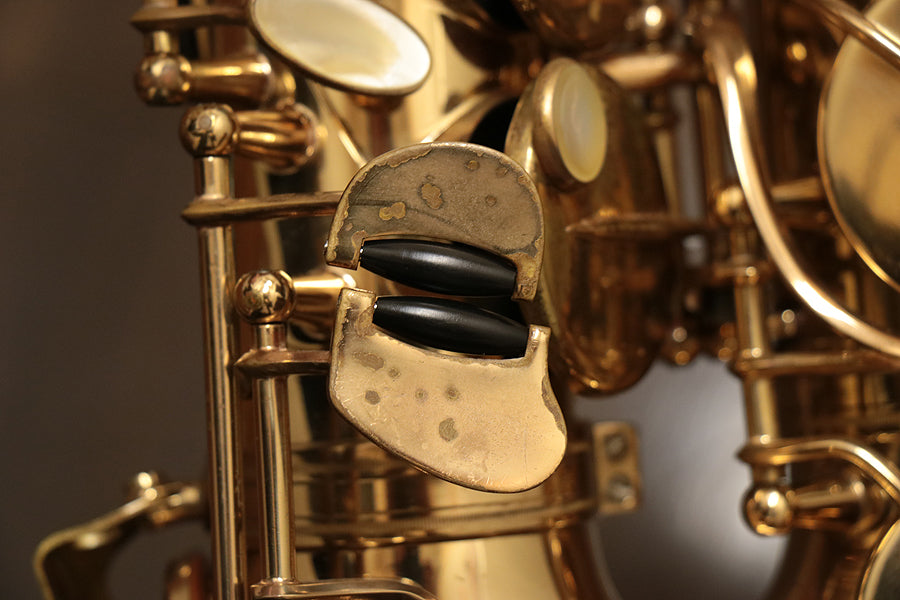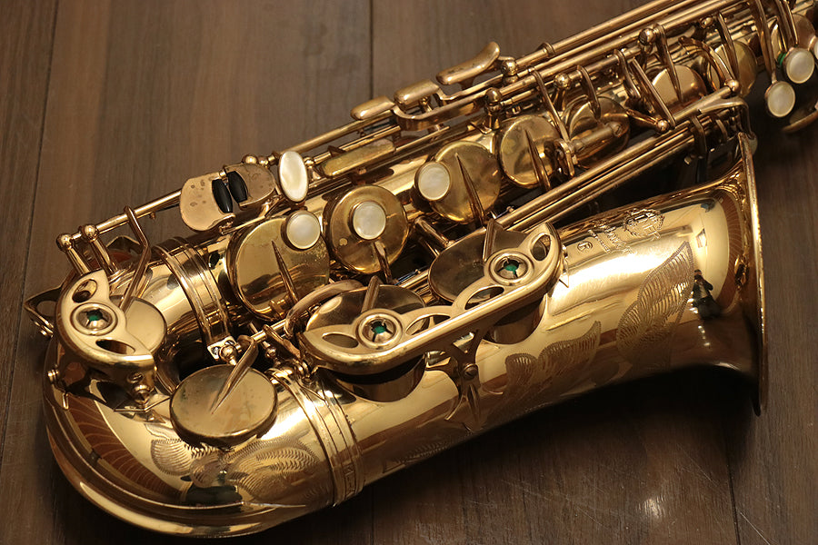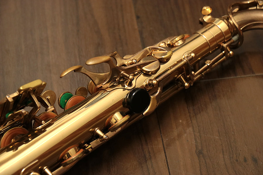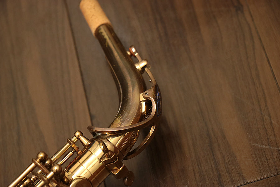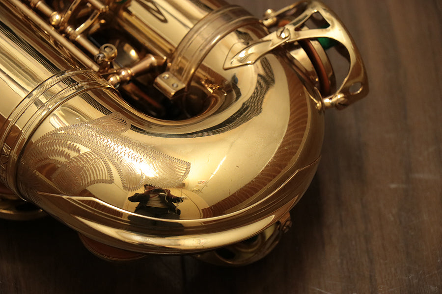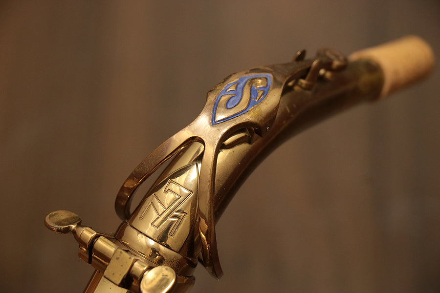 1980年頃製造のフランスセルマー・マーク7。約20年間製造されたマーク6からモデルチェンジを果たし、各キィパーツの大型化、管厚・管体設計を見直し、当時サックスに要求された更なるダイナミクスの拡大とパワフルなサウンドへと進化を遂げました。当時のジャズシーンもやはりアコースティックな編成からエレクトリック楽器が普及し始めた時代背景もあり、このマーク7はフュージョン・ロック・クロスオーバーといったミュージックシーンを支えた名器と言えます。