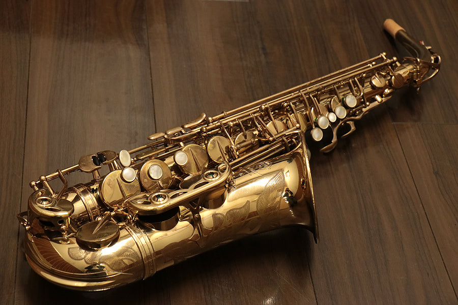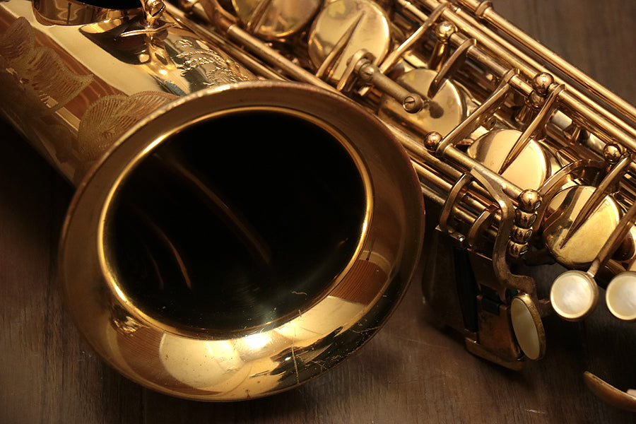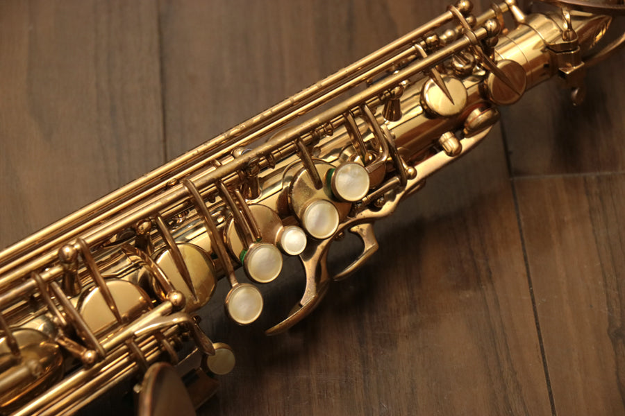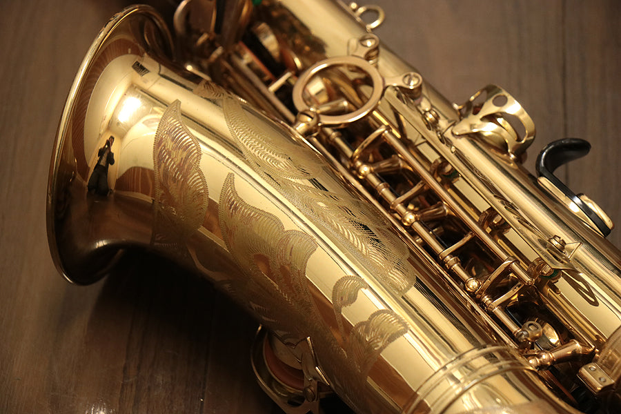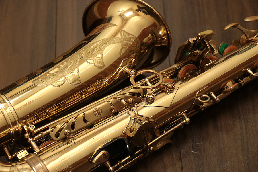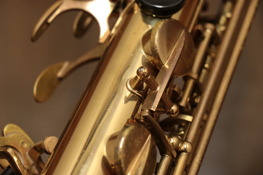 1980年頃製造のフランスセルマー・マーク7。約20年間製造されたマーク6からモデルチェンジを果たし、各キィパーツの大型化、管厚・管体設計を見直し、当時サックスに要求された更なるダイナミクスの拡大とパワフルなサウンドへと進化を遂げました。当時のジャズシーンもやはりアコースティックな編成からエレクトリック楽器が普及し始めた時代背景もあり、このマーク7はフュージョン・ロック・クロスオーバーといったミュージックシーンを支えた名器と言えます。