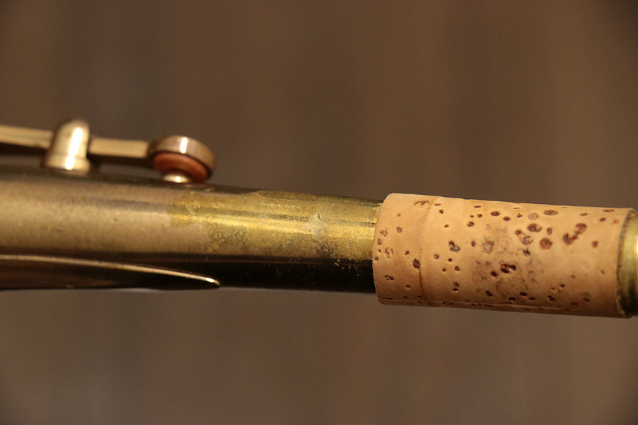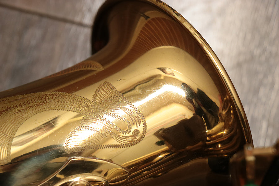 コンディション:全体的にオリジナルのラッカーは暗めな色合いに変色が進んでいます。ベル・U字管に彫刻が施されています。指の当たる箇所を中心にラッカー剥がれが目立ちます。彫刻部にはサビの発生が見られます。全体的に地金からのサビの発生、ラッカー剥がれが見られます。