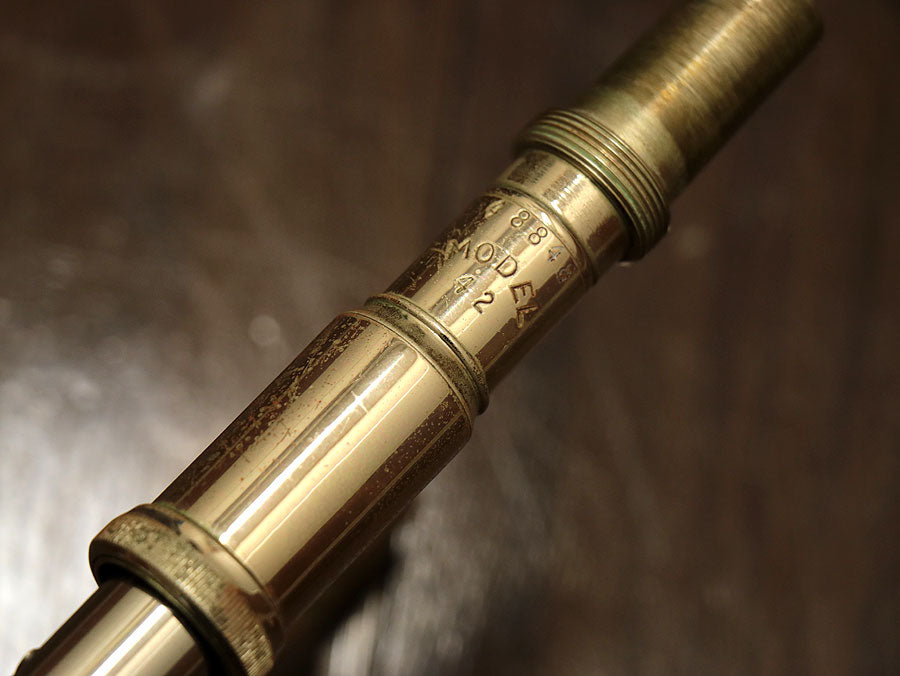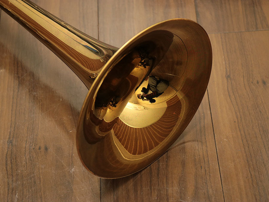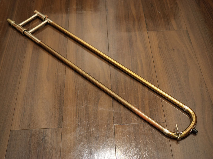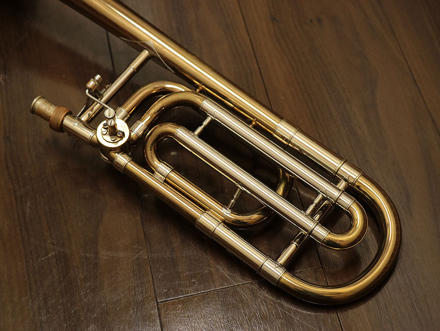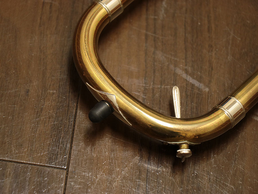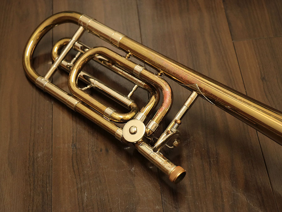 A thick tenor-bass trombone that boasts an unshakable reputation as a standard for orchestral players around the world, the F attachment features a traditional-wrap rotary valve that provides a pleasant sense of resistance and a dense, tight tone. The serial number indicates that it was manufactured in the early 1980s. Overall, use scratches and rust from the base metal are visible throughout. There is a dent repair and solder restoration on the slide U-shape part, which leaves a dent.