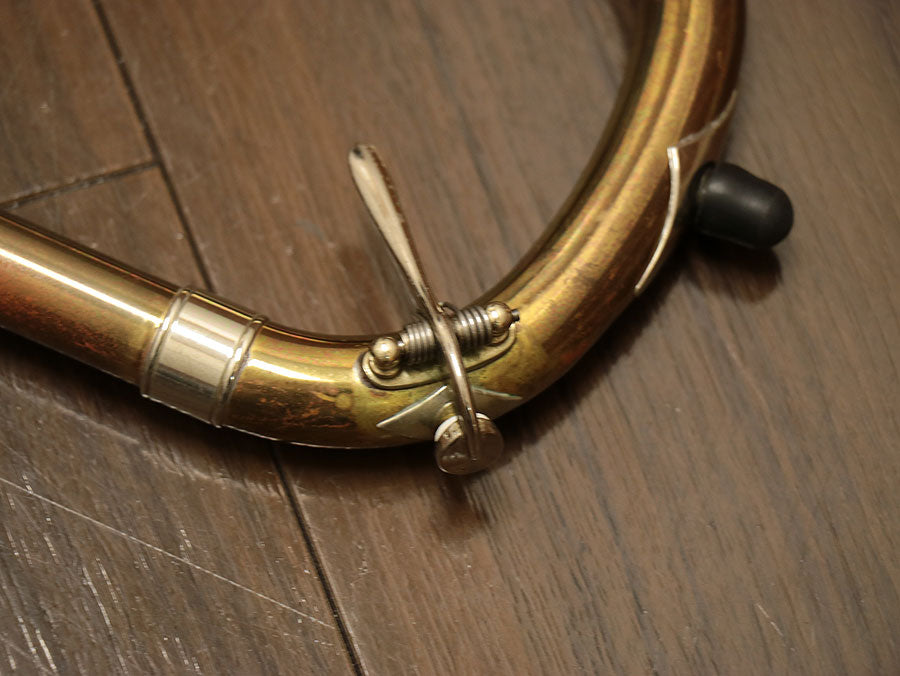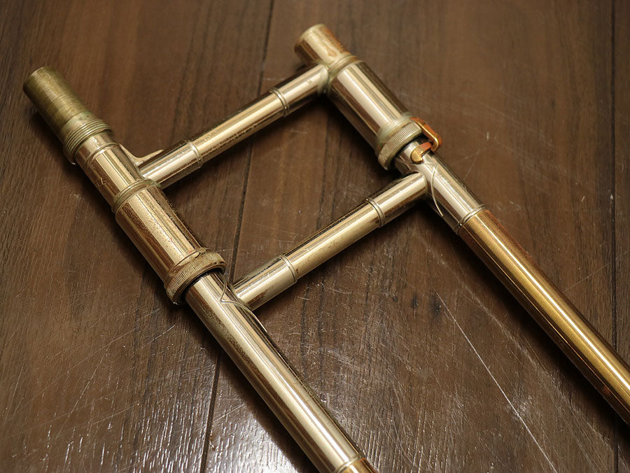 Condition: Overall, use scratches and rust from the ground metal are visible throughout. There is a dent repair and solder repair mark on the slide U-section, which leaves a dent.