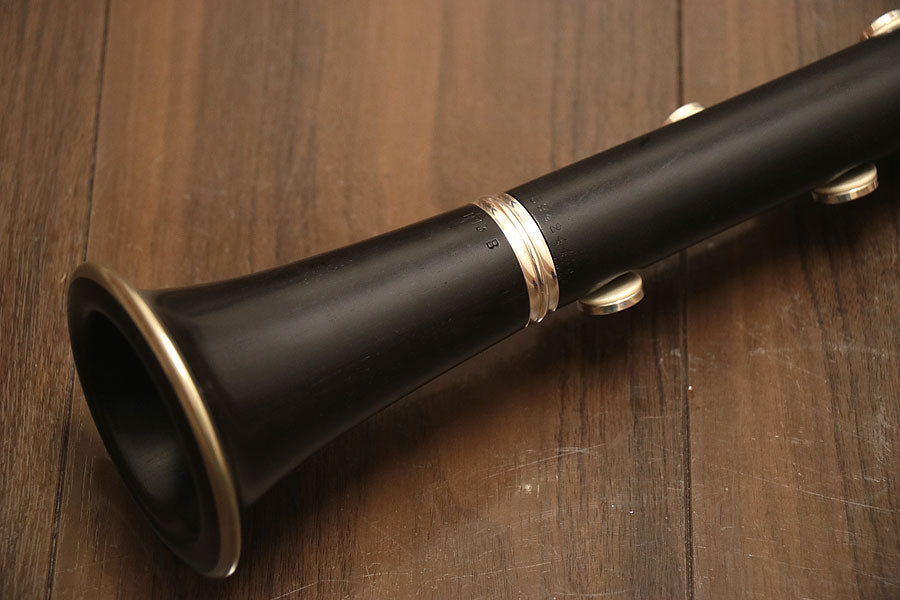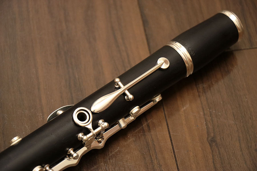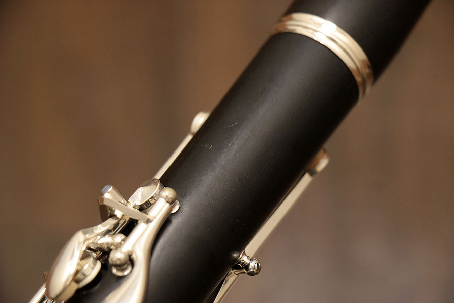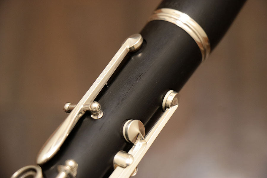 クラリネットの王道ブランドの世界的名機・R-13は、世界中のオーケストラ、吹奏楽、ソロ、室内楽の舞台に求められる世界標準のクラリネットです。日本のオーケストラ・吹奏楽でも愛用者が非常に多く、高い人気を誇ります。指掛け可動式。キィパーツは銀メッキ仕上げ。全体的に使用キズ、ロゴの薄れなど使用感が見られます。上管に割れ修復跡が見られます。全タンポ交換を含む全体調整済み。