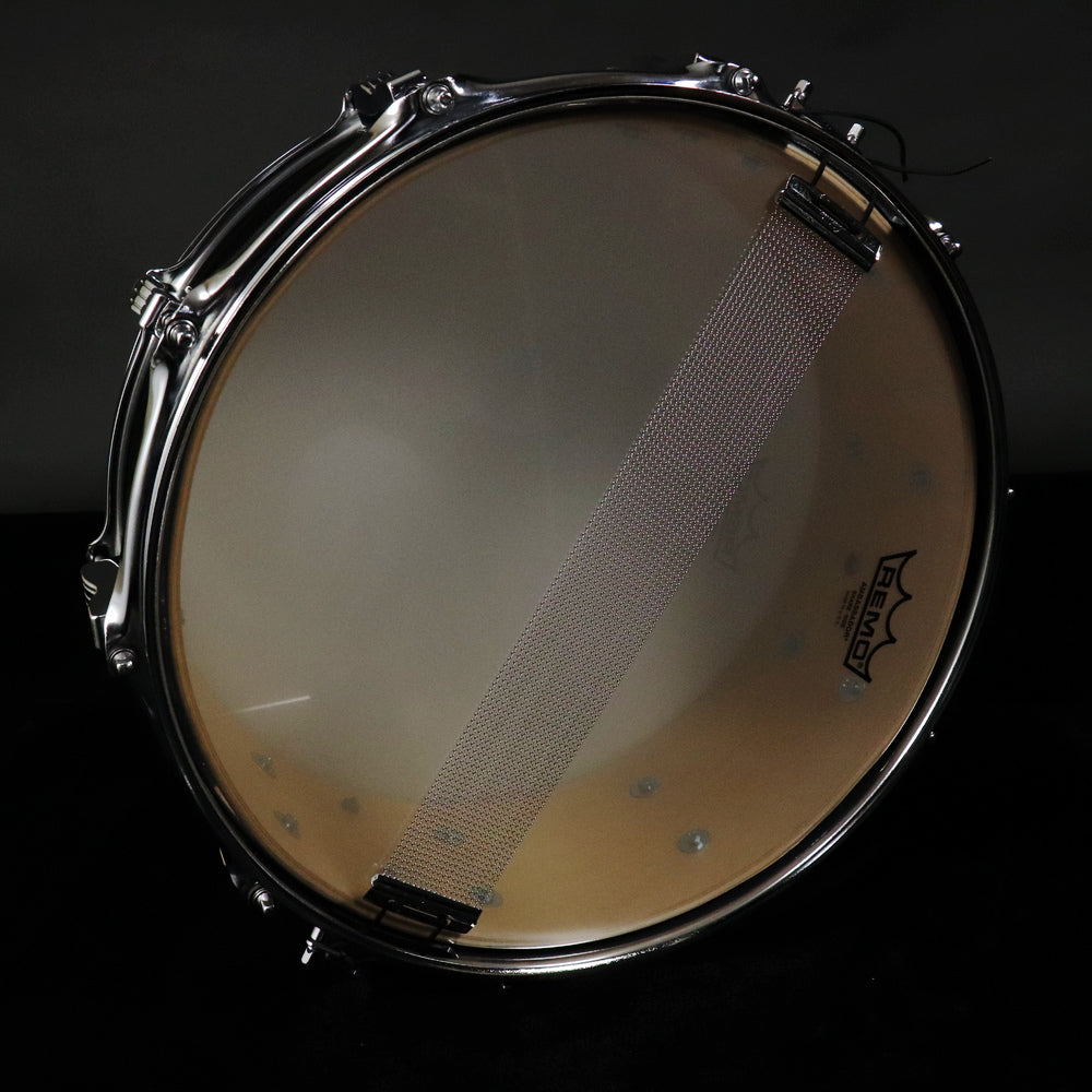 ヘッド両面交換、クリーニング済み。シェルに歪んでいる箇所あり(スネアサイド側に2箇所)。ストレイナーがINDe製に、打面フープが交換されています(おそらく1.6mm程度の薄くて軽いもの)。シェル表面にザラつきが有り一部指紋なども見受けられるため上塗りされている可能性が高いと思われます。