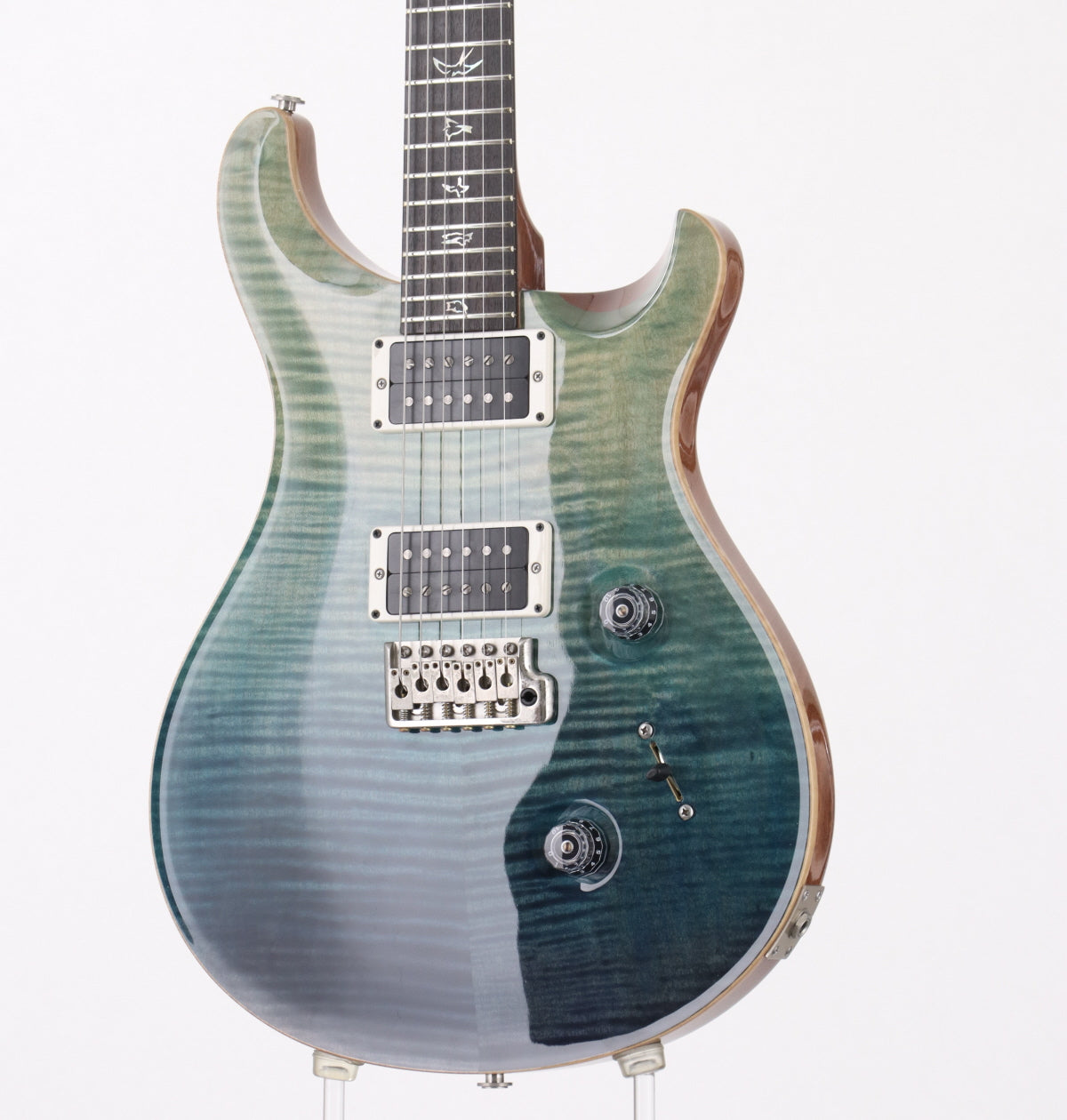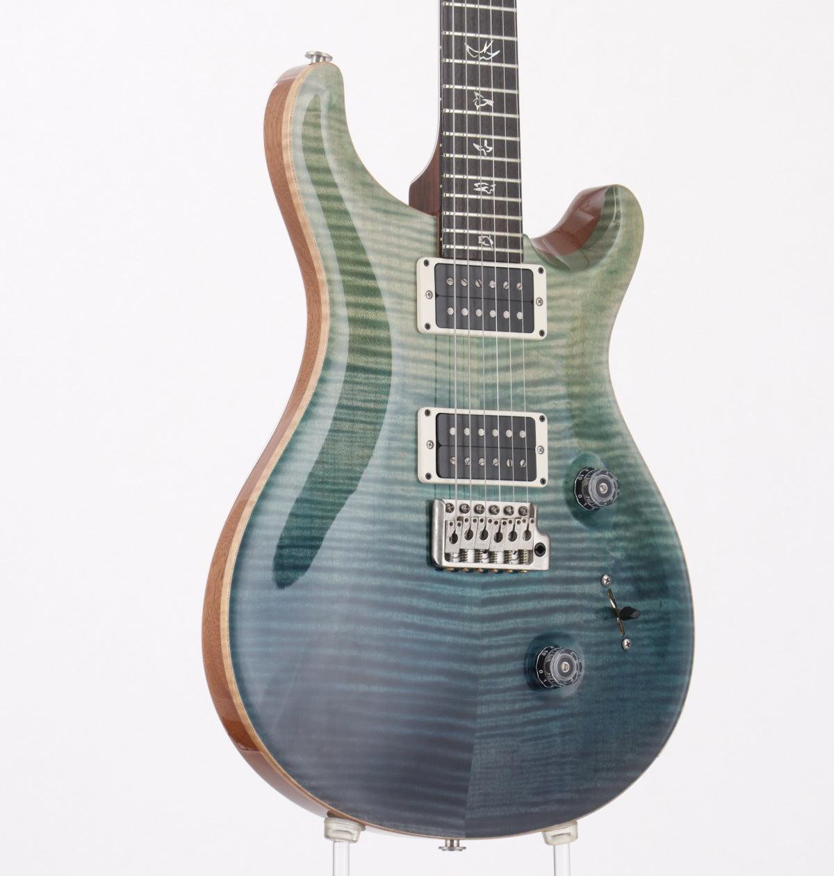 There are some scratches and scuffs on the body. There is a ding on the left side of the rear PU on the top of the body, but it is not whitened and blends in with the surrounding area, so it is not so noticeable. The blue tint on the top of the body has faded, which is one of the common aging effects of PRS blue tones. The color has faded a little, especially on the sides of both PUs where the body rises up. There are no noticeable signs of use, although each hardware has some smudges.