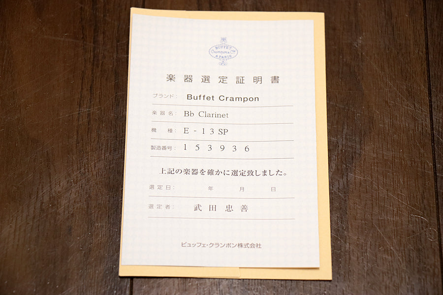 クラリネットの老舗ブランド・ビュッフェクランポンの世界的スタンダードモデルであるR-13のサウンドを受け継ぎながら初心者でも扱いやすく、比較的柔らかいリードを使うビギナーでも音程の取りやすい楽器として人気のE-13。キィパーツは銀メッキ仕上げ。指掛けは可動式。武田忠善氏による選定書が付属します。全体的に使用キズが見られます。薄くなったロゴが補修されています。