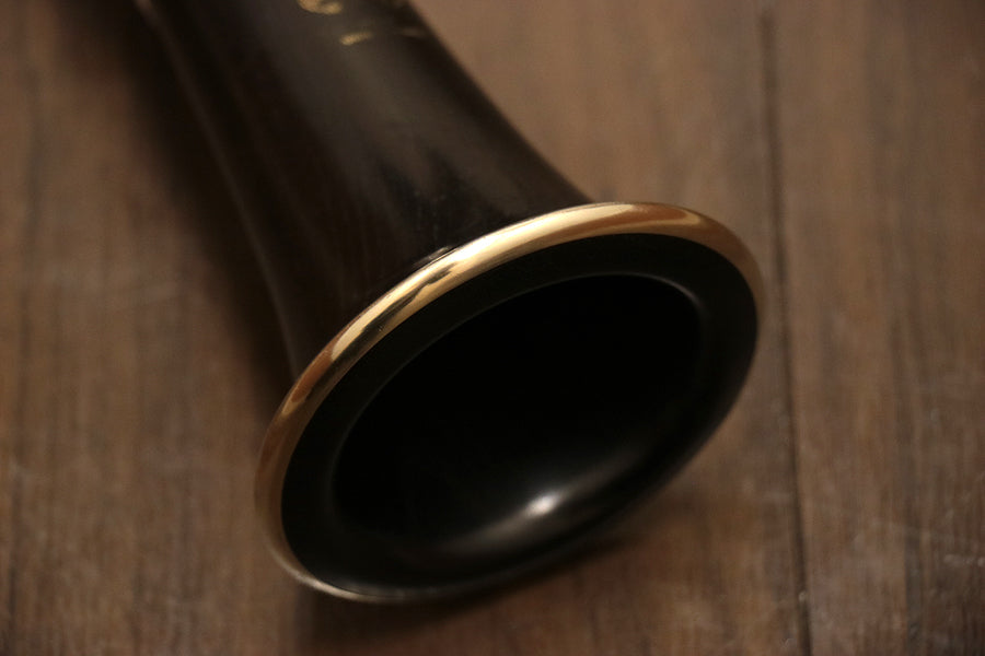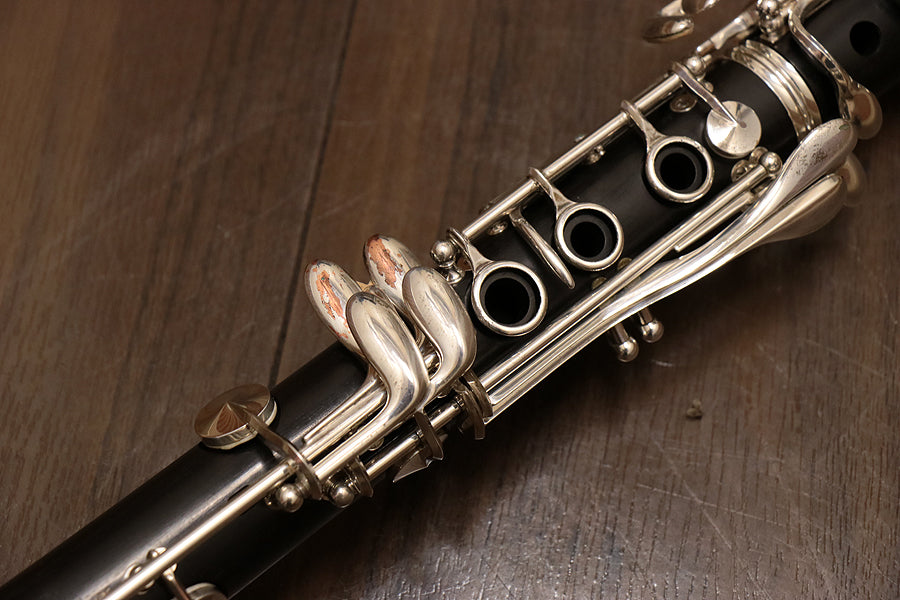 The R-13, a world-famous clarinet from the royal road brand of clarinets, is a world-standard clarinet sought after by orchestras, brass bands, soloists, and chamber music stages around the world. It is highly popular among Japanese orchestras and brass bands as well, with a very large number of loyal users. The serial number indicates that this clarinet was manufactured around 2004. The finger rest is movable. Key parts are silver plated. Overall, there are scratches, faded logo, and rust from key parts. The maker's logo has been color-corrected. Included mouthpiece is a Vandoren 5RV ryer.