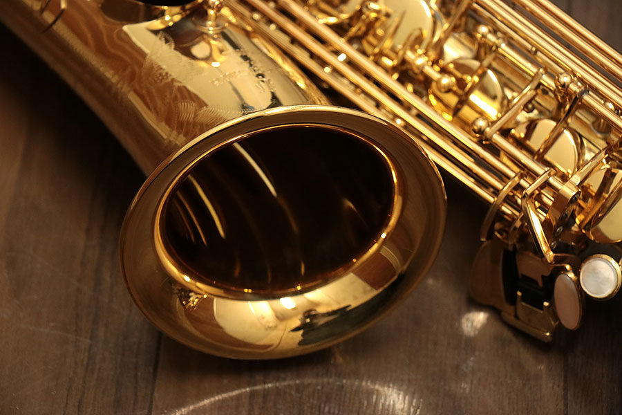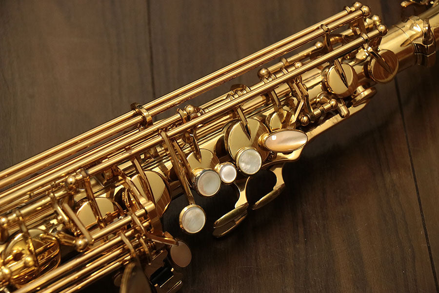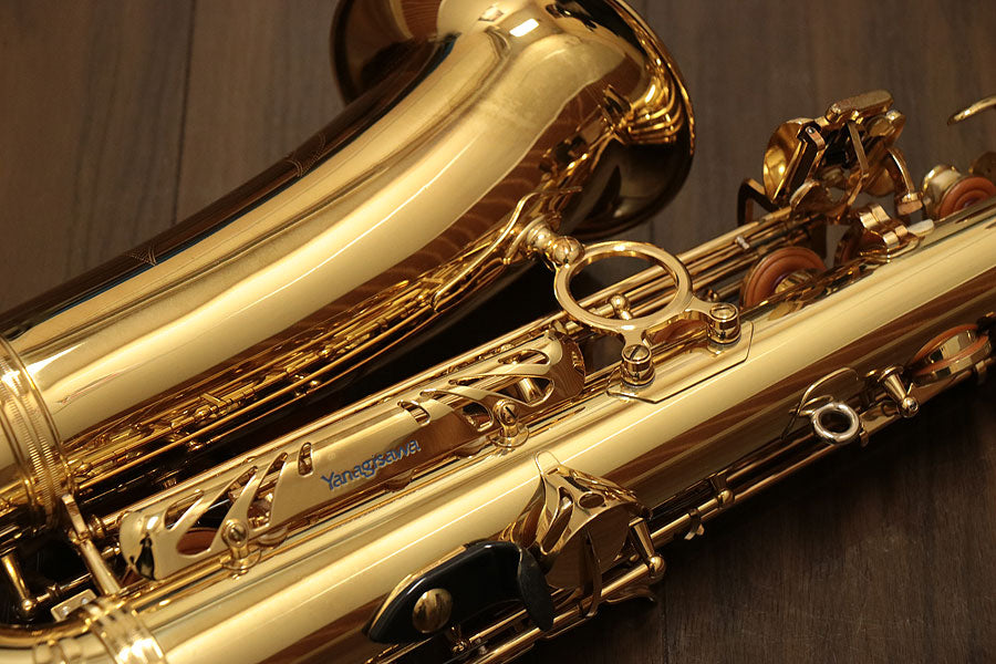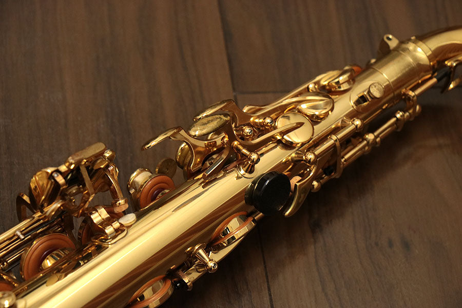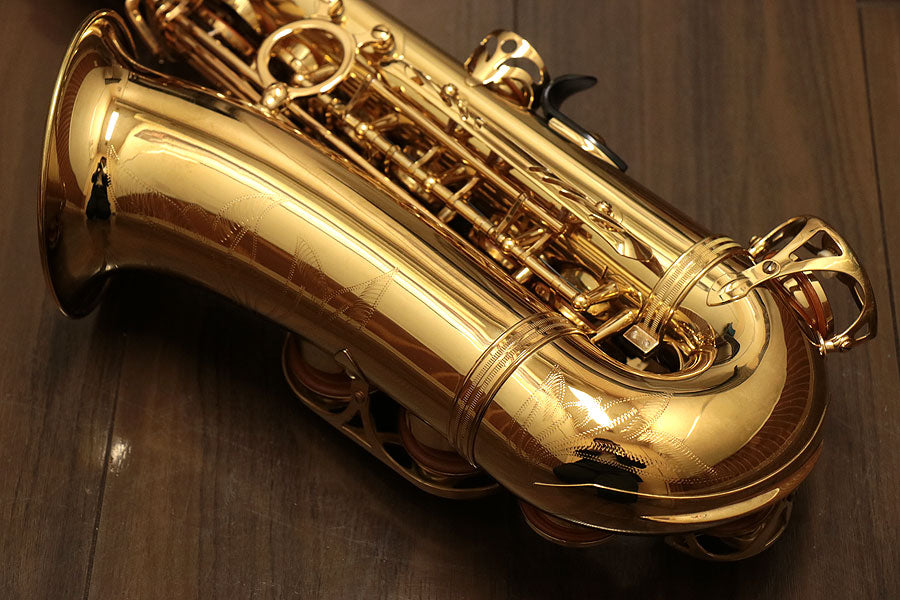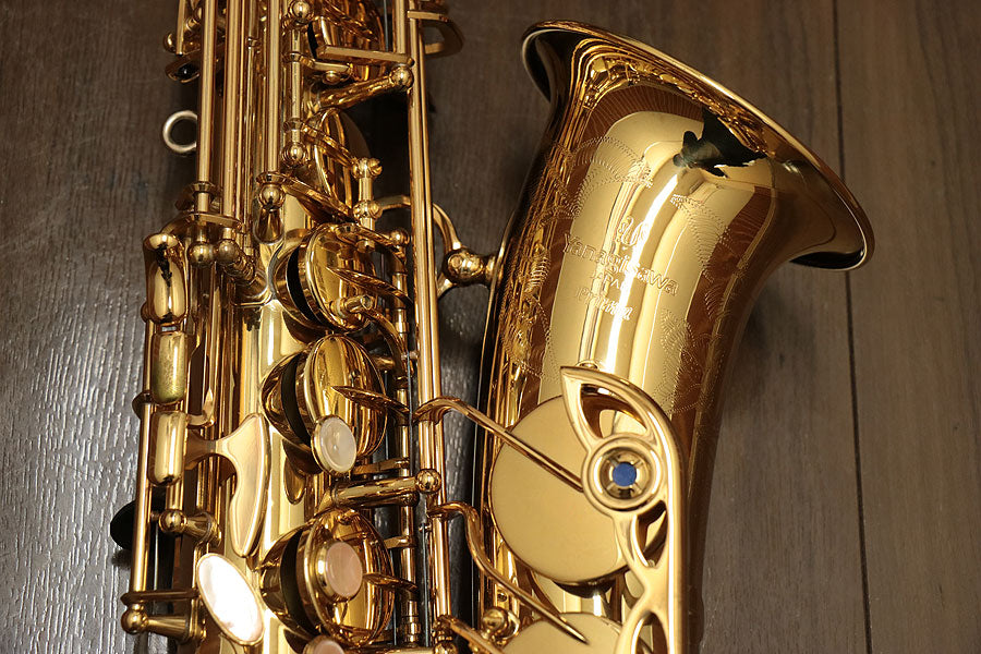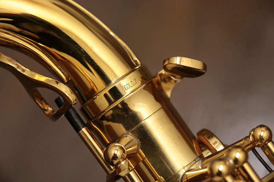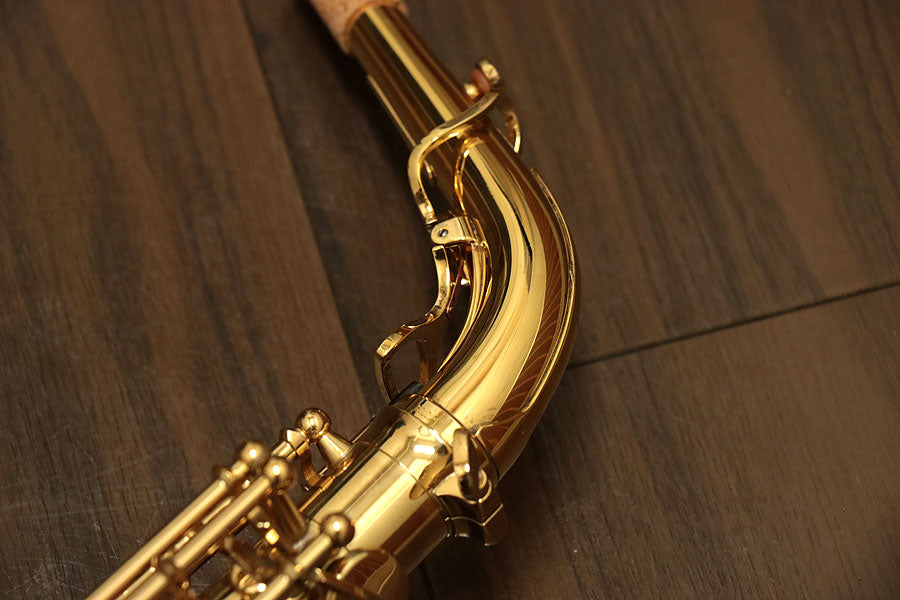 1990年代に製造されていた当時のヤナギサワサックスのイエローブラス管体・ラッカー仕上げ。現行のA-WO10に相当する上位モデル。ネックはアッパースタイル、金メッキ仕上げのものが付属しております。キィメカニズムは現代的でコンパクトな配列と高い音程精度が印象的なモデル。全体的に使用キズが見られ、地金からのサビの発生が目立ちます。E♭キィガードとベルキィガード台座にハンダ修復跡。