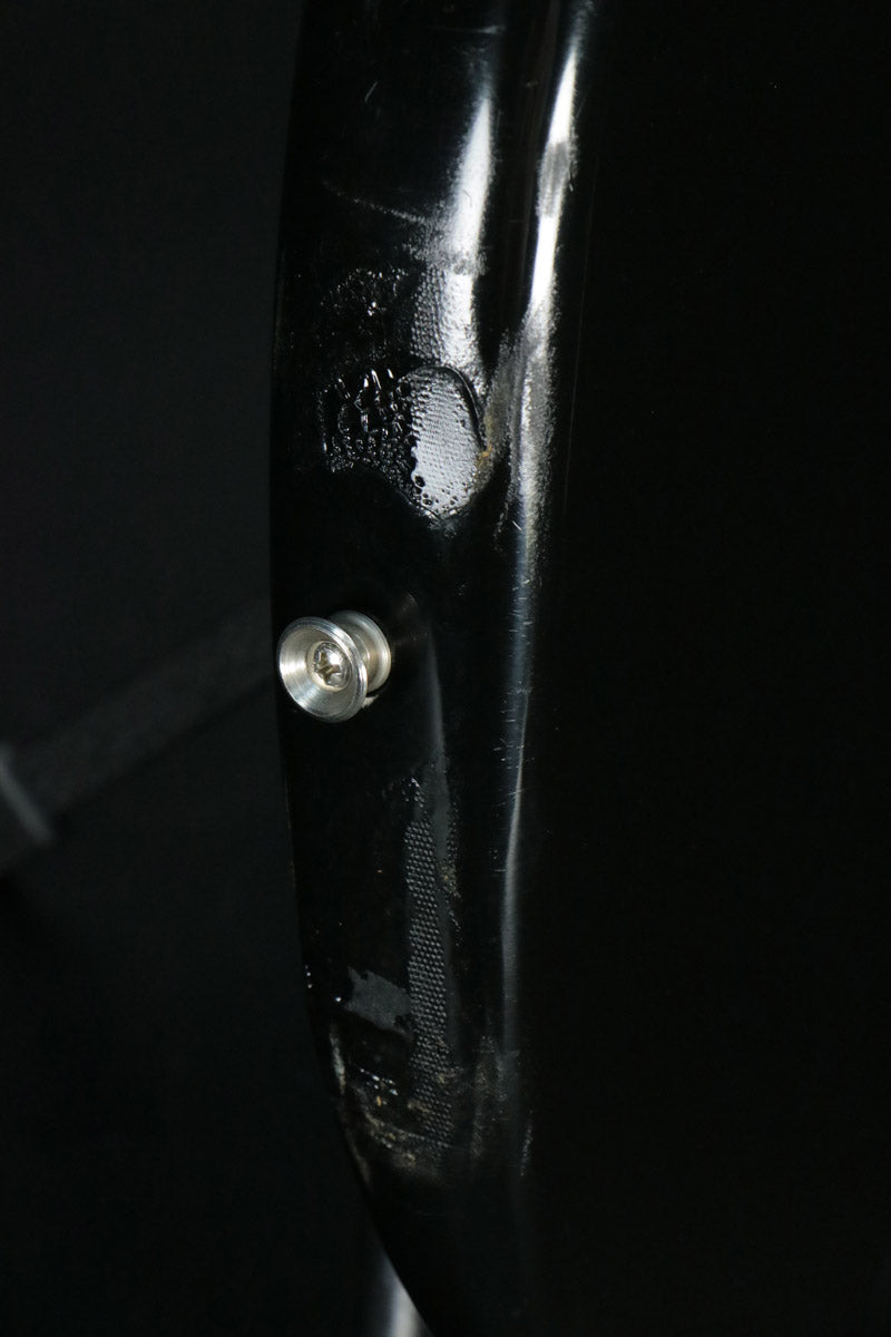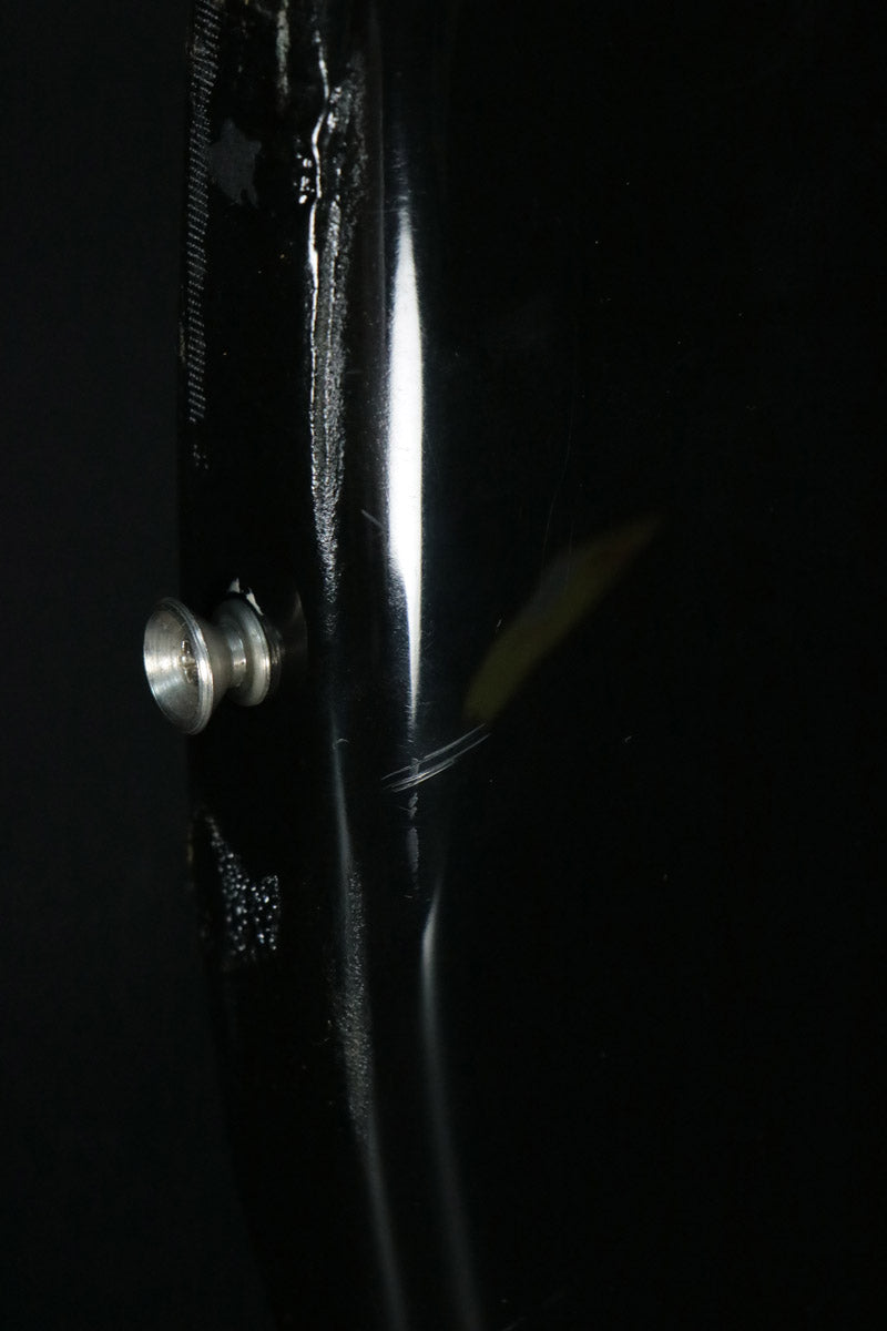 ボディには拭きキズ、スリキズ、スタンド焼けがあります。ボディトップ下部エッジ部分にスリキズがあり、右下部分には引っ掻きキズがあります。6弦側ホーン先端部分にはケース内張りとの塗装反応があります。ボディエンドストラップピン両脇に大きめのスタンド焼けがあります。惜しいっす!これがなかったらパーフェクトなんですけど・・・。ボディバック下部外周エッジ部分にはスリキズがあります。ヘッド外周部分には小さな当てキズがあります。各ハードウェアにはクスミはあるものの目立つ使用感はありません。