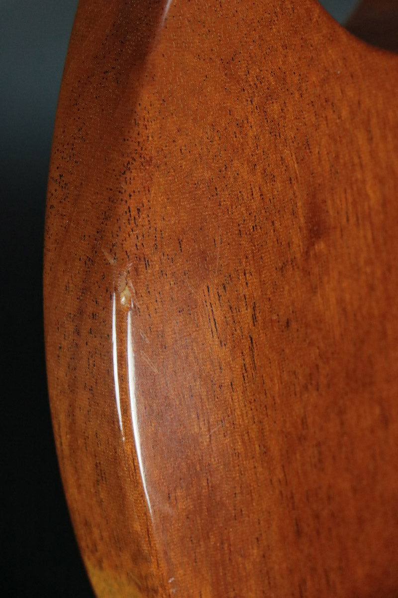 本来はアニリンダイに比べると控えめながらも赤いチェリーカラーでしたが、経年褪色によってウォルナットもしくはナチュラルカラーのような渋みの増した落ち着いたルックスに仕上がっております。エスカッションや裏パネルを外せば元のチェリーカラーの名残が確認出来ます。