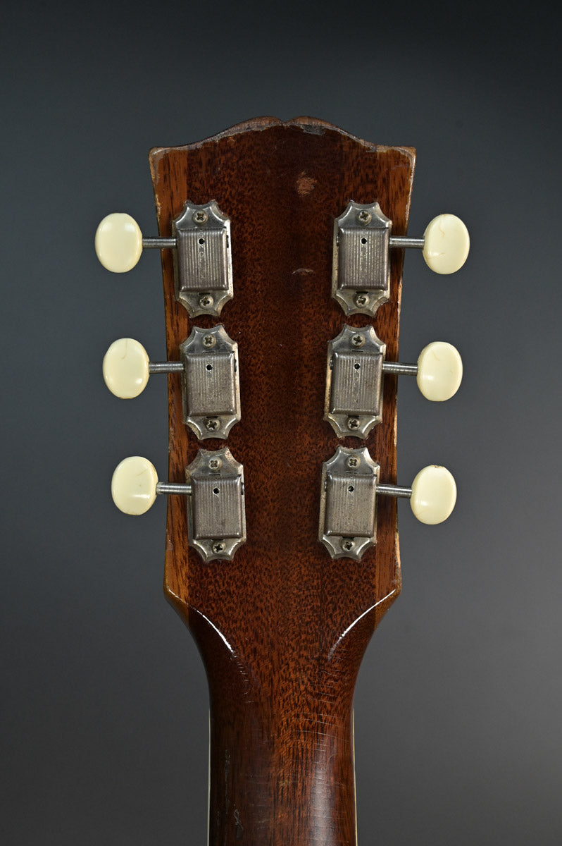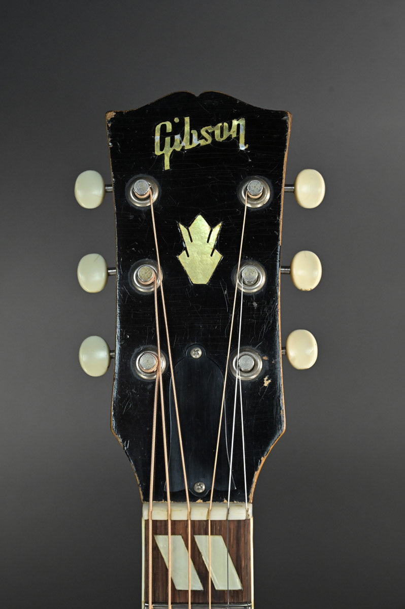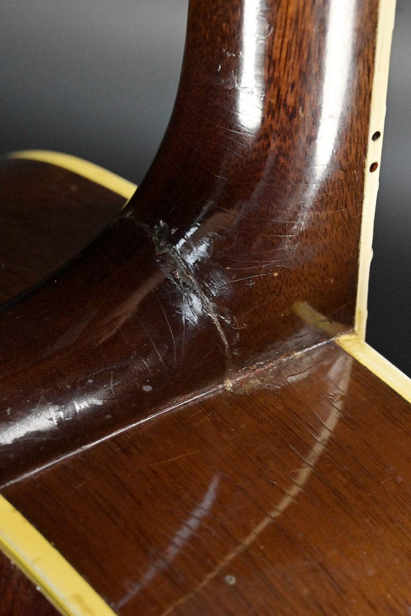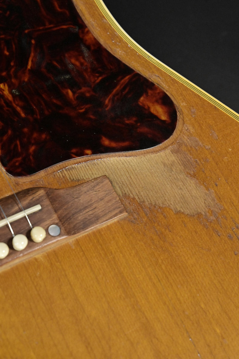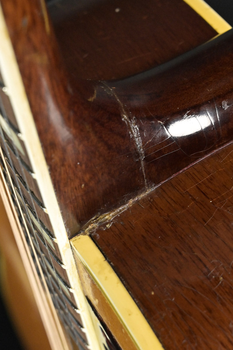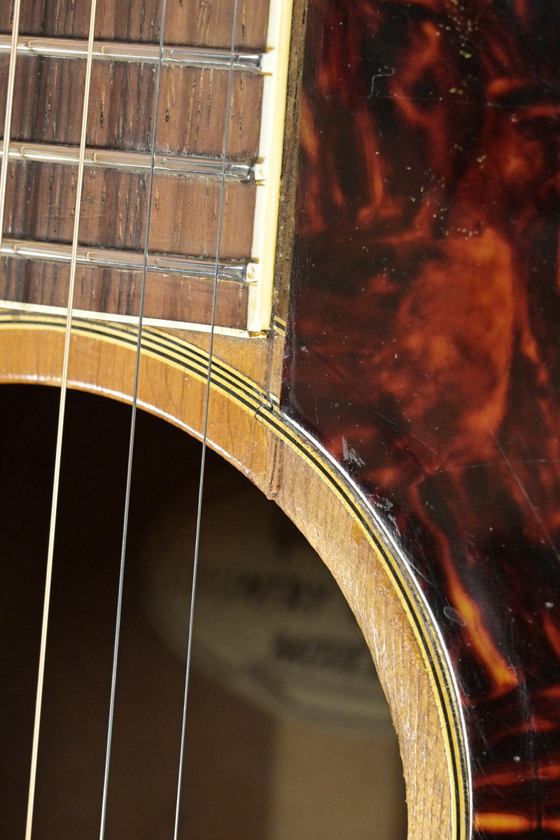 シリアルナンバーから1959年製と判断しております。ナット&フレットは交換されております。サウンドホール右上指板際とピックガードの間にクラックがあり、割れ止めが当てて処置されております。サウンドホール周りには激しいピッキングにより木部生地がみえており、ピックガード下部には指をそこに置いていたのか凹みがあります。ピックガードが収縮しており元々のサイズ跡があります。またピックガード右上には、約8cm程の棒状の補修跡があります。裏面にはその痕跡がない為表層のみ剥がれ、そこを補修したものと思われます。いずれもその補修跡にクリア塗装が載っているため、オーバーラッカーが施されております。ネックヒール部分には直線的なクラック補修歴とネックジョイント両脇には、そのクラック発生時にできた隙間を埋めるために豪快な接着剤のはみ出しがあります。1弦6弦のペグが曲がっていますがチューニングには問題ありません。ローポジションには指跡があります。