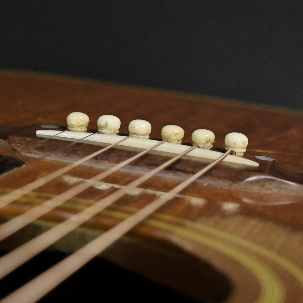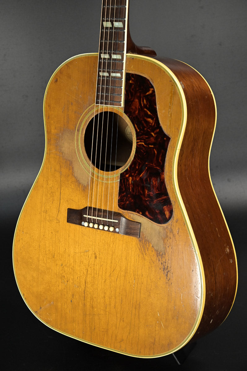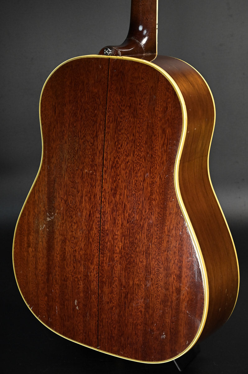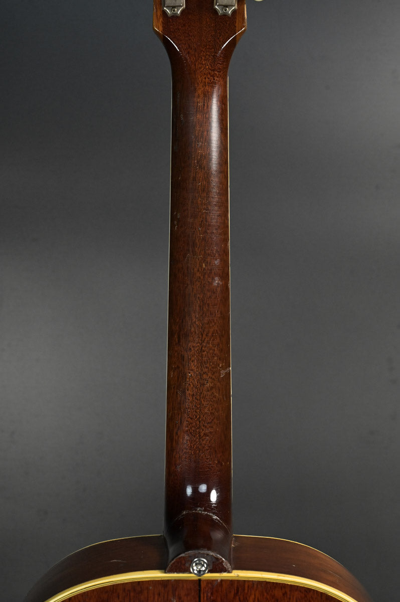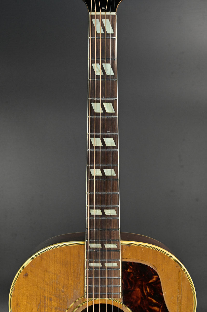 シリアルナンバーから1959年製と判断しております。ナット&フレットは交換されております。サウンドホール右上指板際とピックガードの間にクラックがあり、割れ止めが当てて処置されております。サウンドホール周りには激しいピッキングにより木部生地がみえており、ピックガード下部には指をそこに置いていたのか凹みがあります。ピックガードが収縮しており元々のサイズ跡があります。またピックガード右上には、約8cm程の棒状の補修跡があります。裏面にはその痕跡がない為表層のみ剥がれ、そこを補修したものと思われます。いずれもその補修跡にクリア塗装が載っているため、オーバーラッカーが施されております。ネックヒール部分には直線的なクラック補修歴とネックジョイント両脇には、そのクラック発生時にできた隙間を埋めるために豪快な接着剤のはみ出しがあります。1弦6弦のペグが曲がっていますがチューニングには問題ありません。ローポジションには指跡があります。