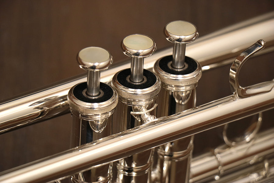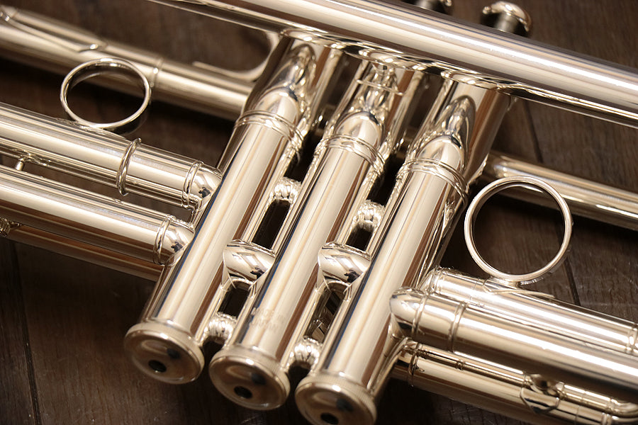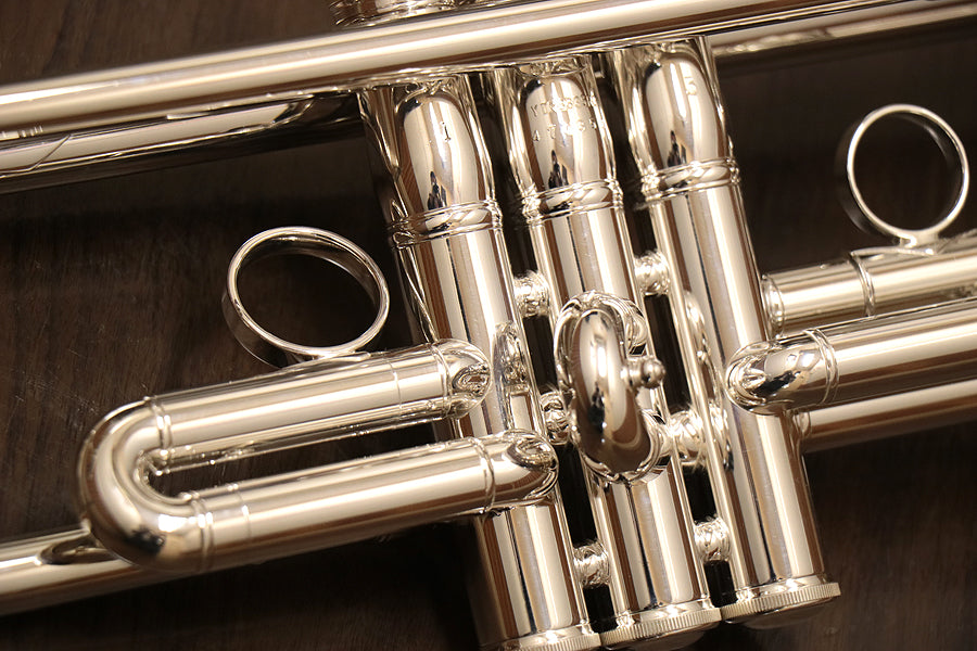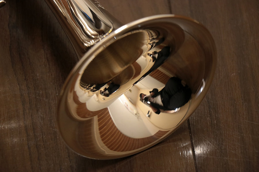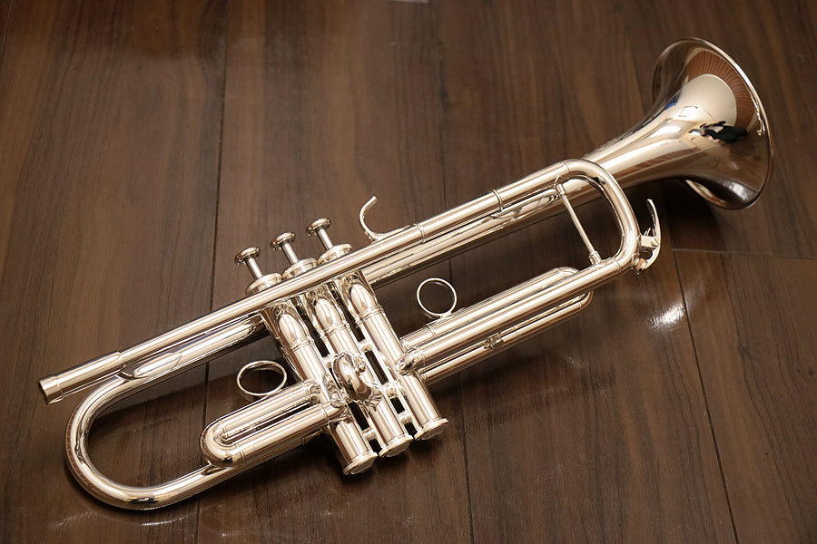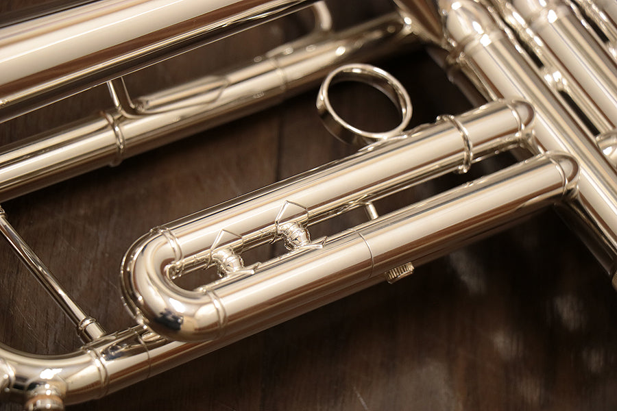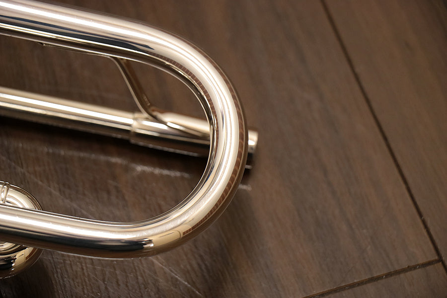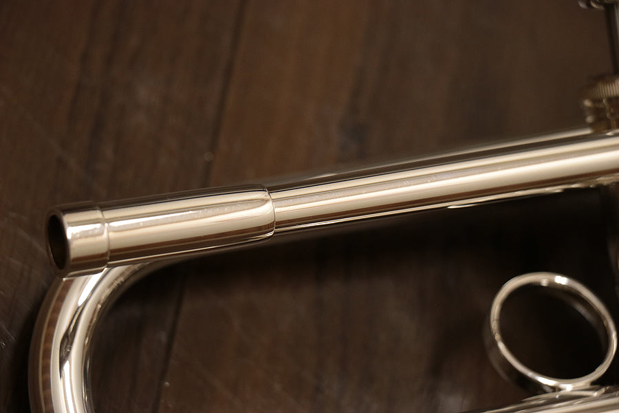 2013年まで製造されていたヤマハ最上位機種・ゼノシリーズのリバースチューニング管・ゴールドブラスベル仕様のトランペットです。MLボア、銀メッキ仕上げ。リバース式主管抜差管を採用し、さらに理想の音色を追求。リバース式ならではの吹奏感や安定感と、銀メッキ仕上げによるやわらかな音色も魅力です。全体的に使用キズ、ベル管に凹み修正跡、3番管に凹み修正跡。ベル管根本に凹みが残ります。