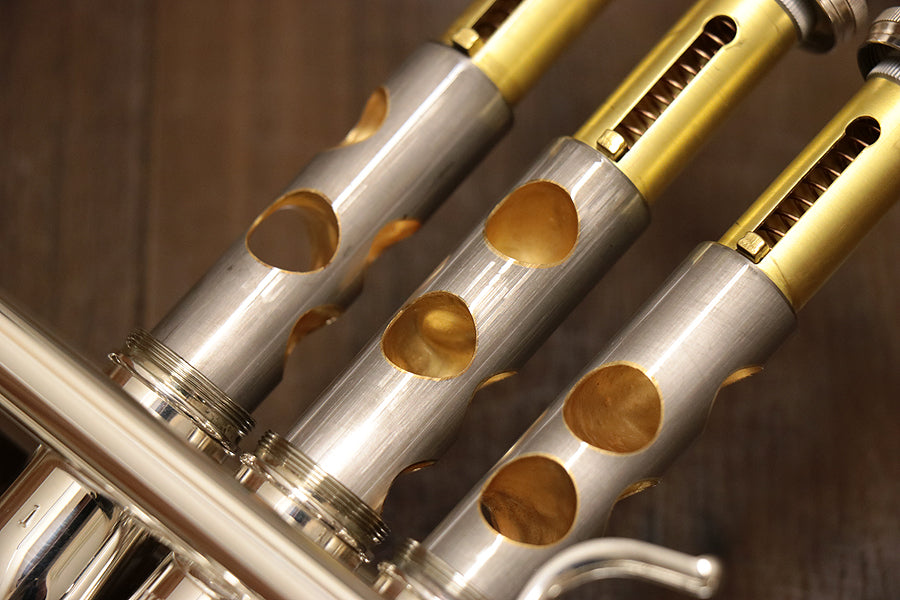 This is a trumpet with reverse tuning and gold brass bells from Yamaha's top-of-the-line Zeno series, which was manufactured until 2013. The reverse tuning main tube extraction pipe has been adopted to further pursue the ideal tone quality. The reverse-tuning design provides a stable and comfortable blowing feel, and the silver-plated finish gives it a soft and gentle tone. Overall, there are scratches from use, a dent on the bell tube, and a dent on the third tube. A dent remains at the root of the bell tube.