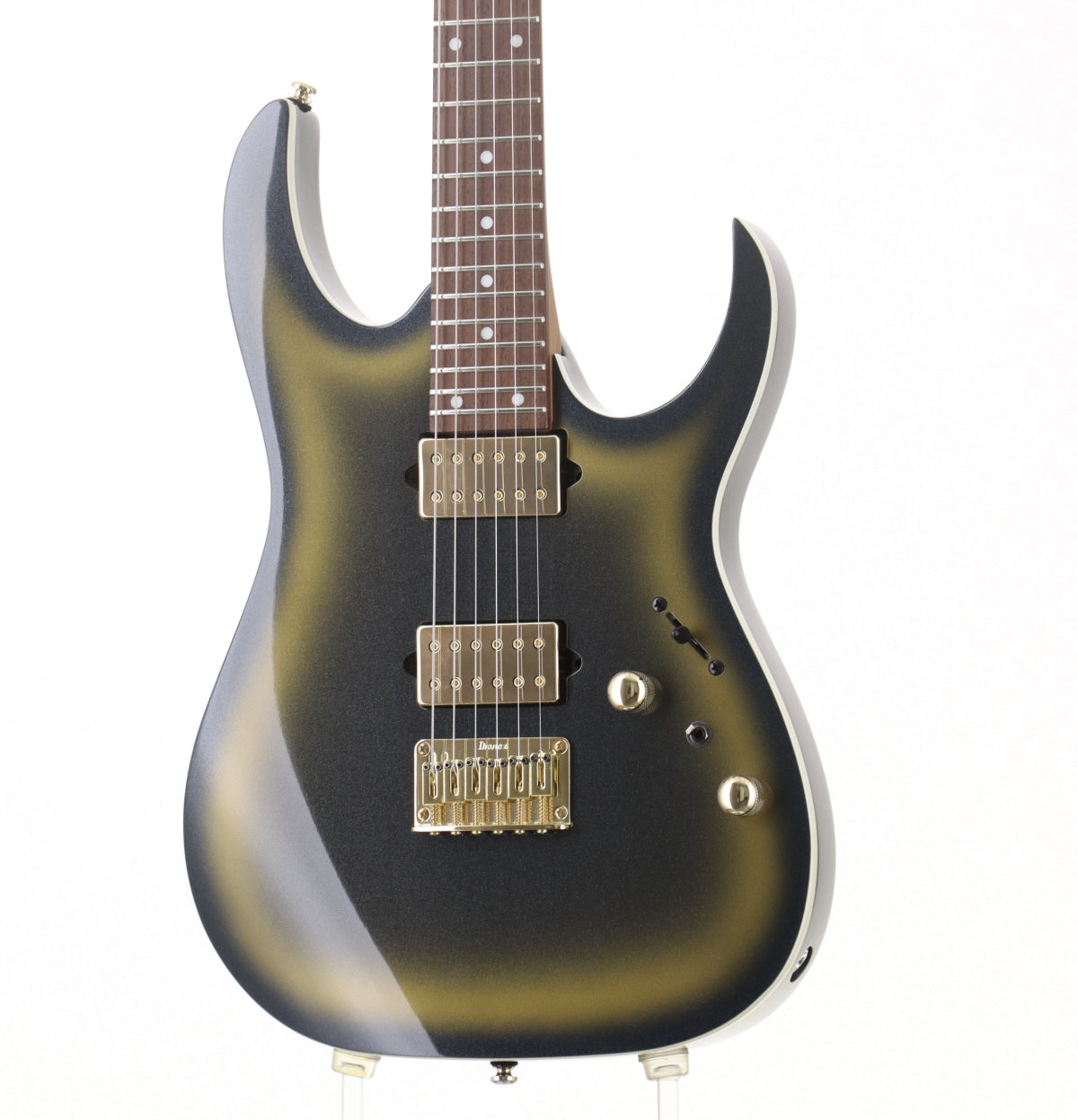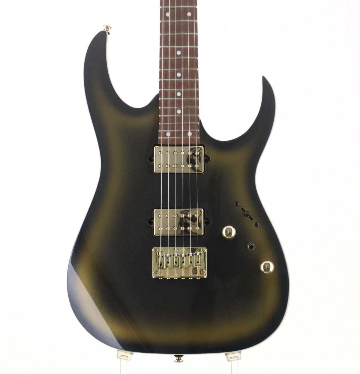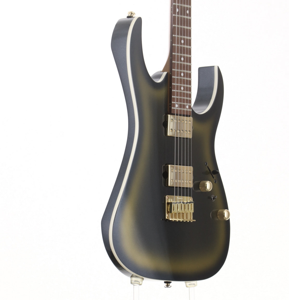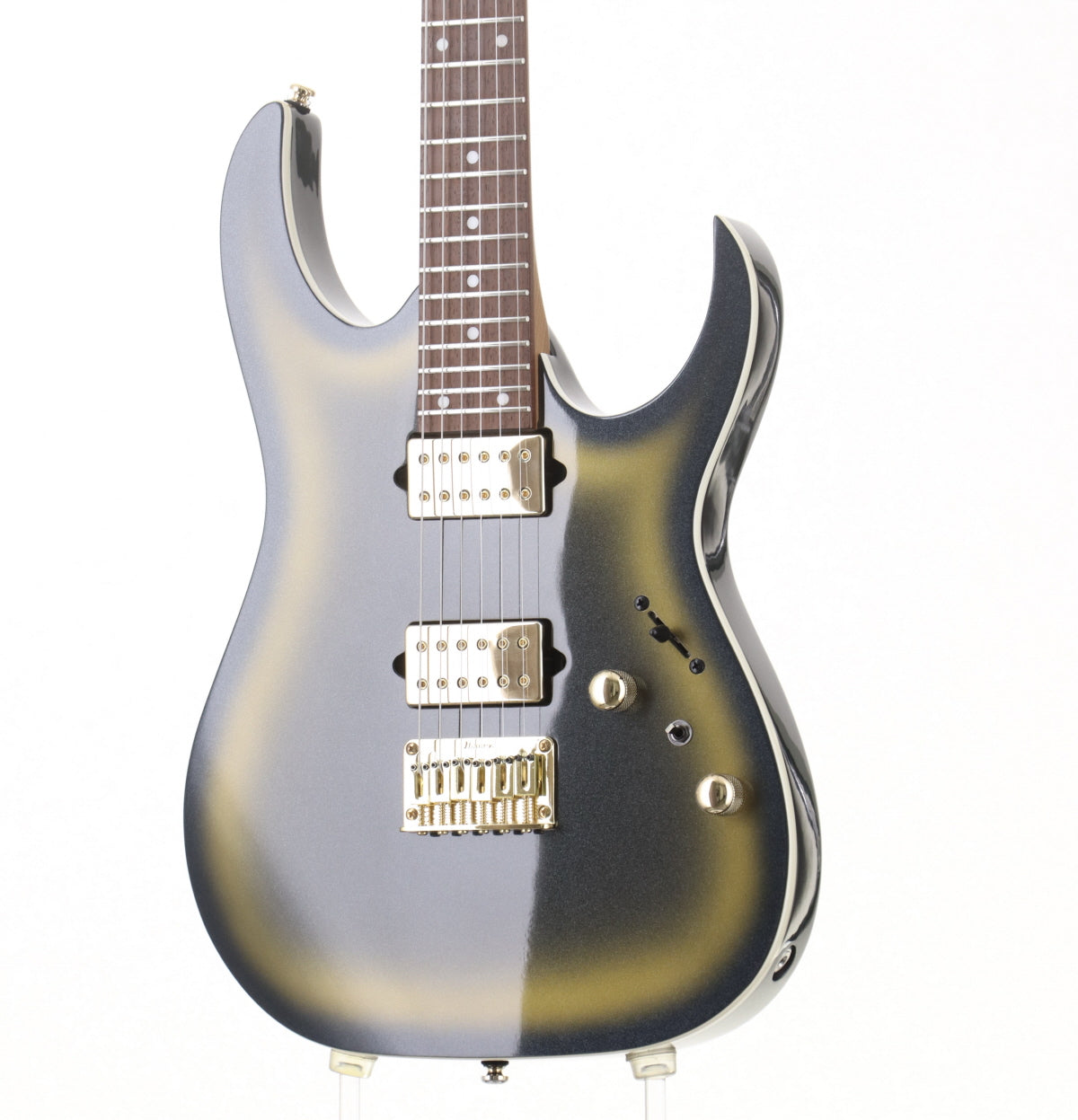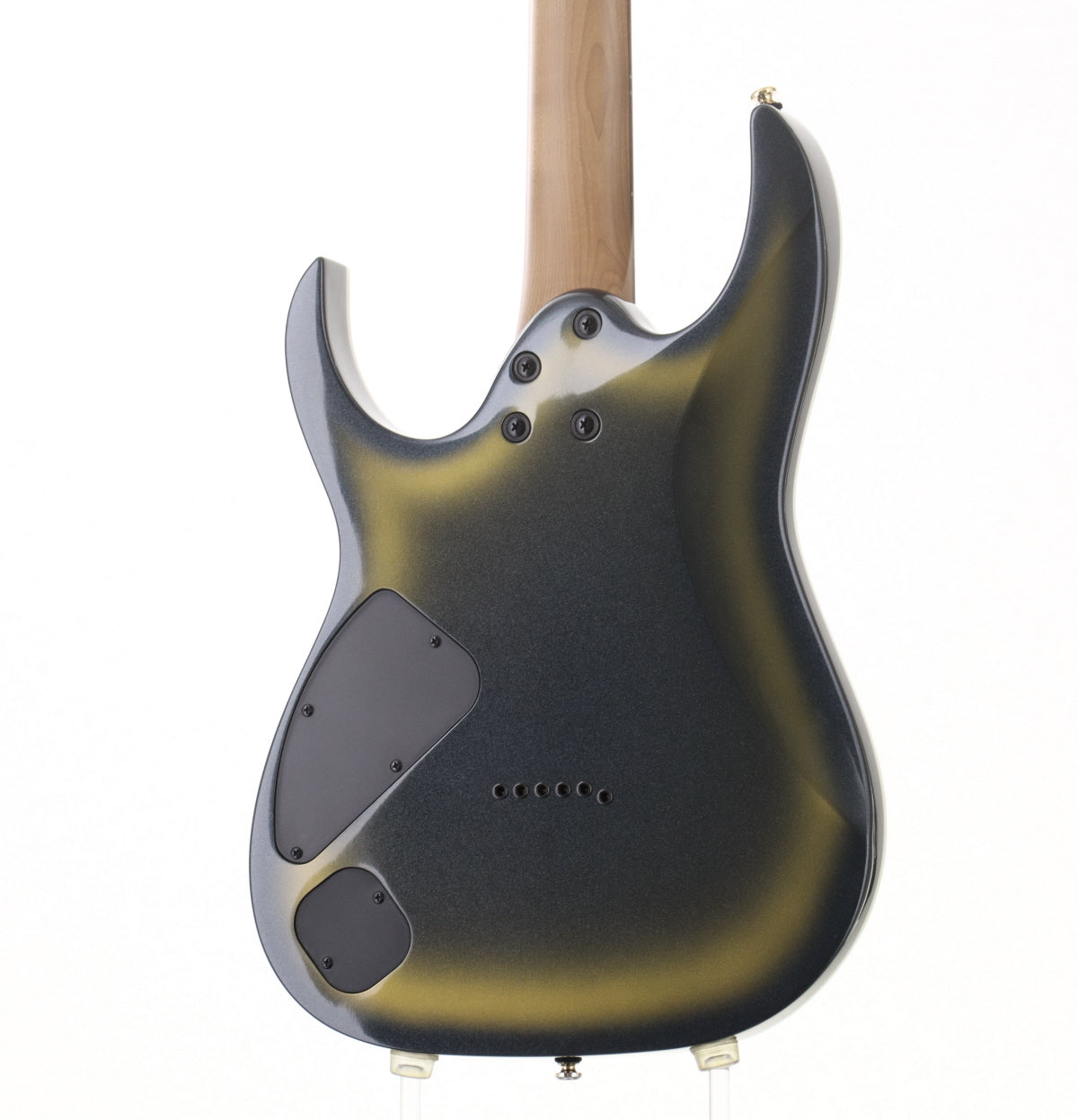 類似モデルから判断するとネックシェイプはおそらくWiazar IIIかと思われます。ほどよく薄く仕上がっており、テクニカルプレイのサポートに一役買ってくれます。 ピックアップはゴールドカバーのディマジオFusion edgeを前後に搭載。