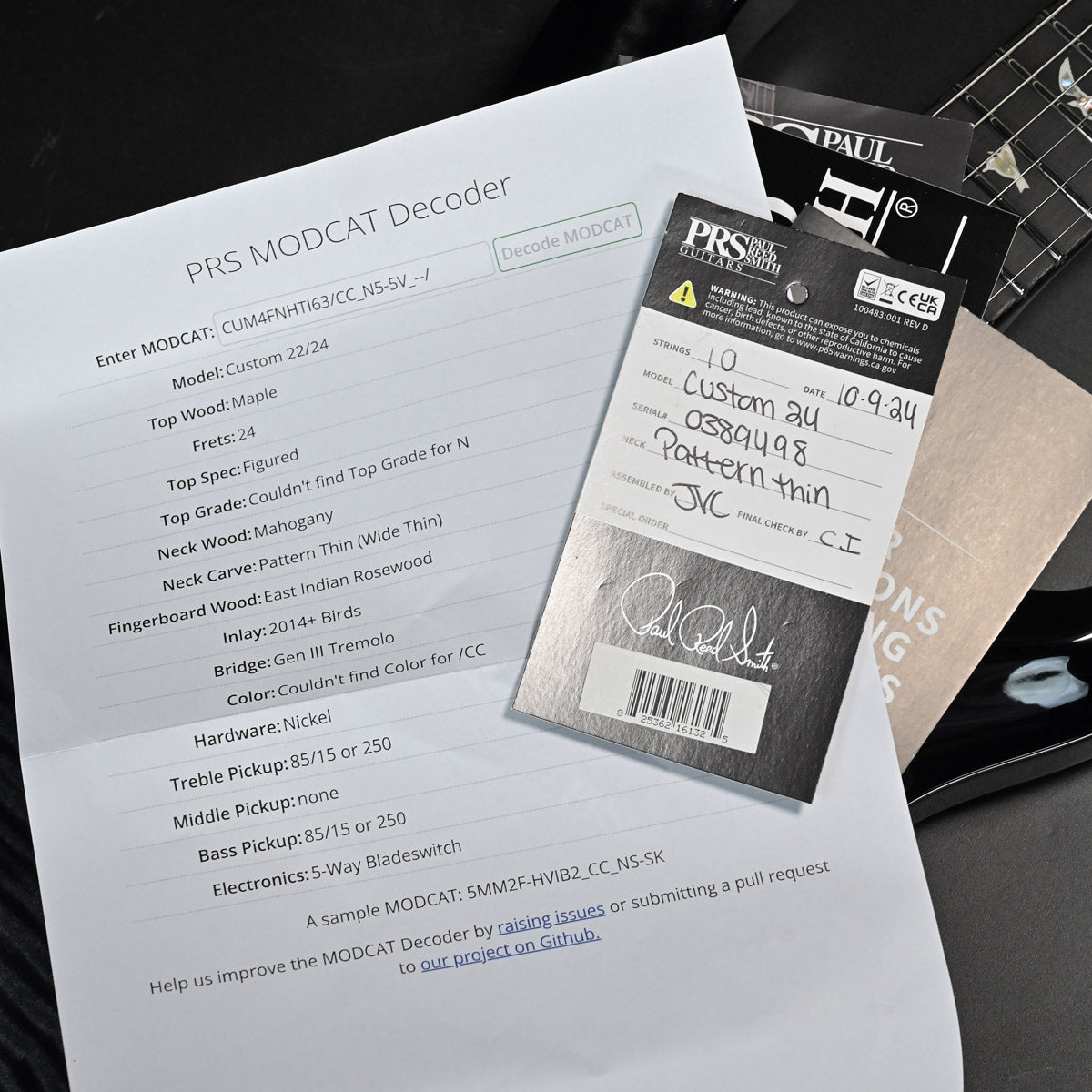 AccessoriesTremolo arm, simple general manual in English, PRS Mod Cat sticker, PRS Mod Cat data copy, Rectangle tag, HC key
