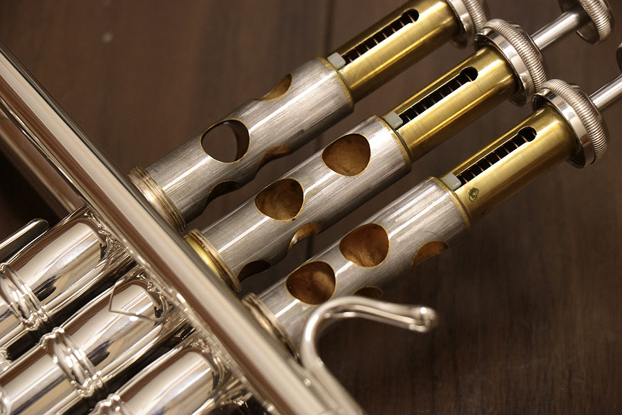 The Stradivarius model with model 180, ML bore, 37 bells, 25 mouthpipes, and silver plated finish is extremely popular all over the world, from professional players to students and beginners. This is the most standard specification among the many variations. Overall, there are scratches from use, and the bell pipe shows signs of dent correction. There are some pitting and rusting from the base metal mainly in the grip area.