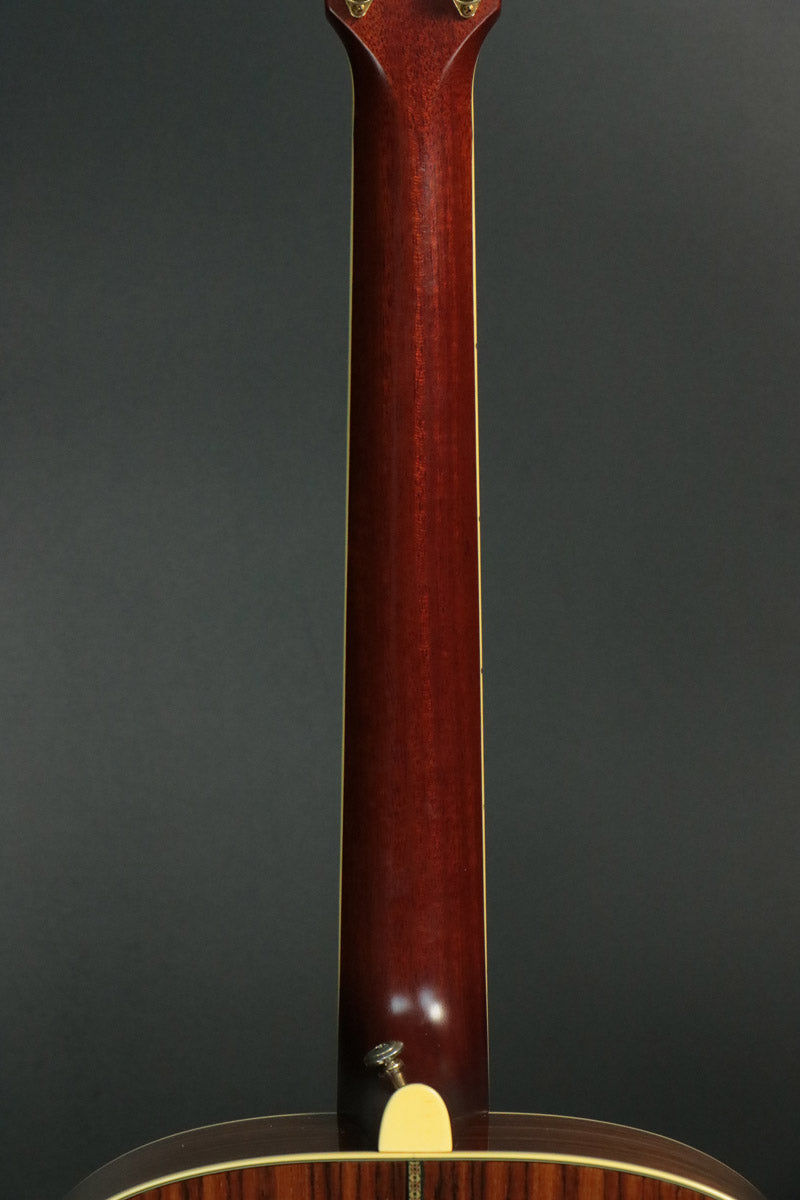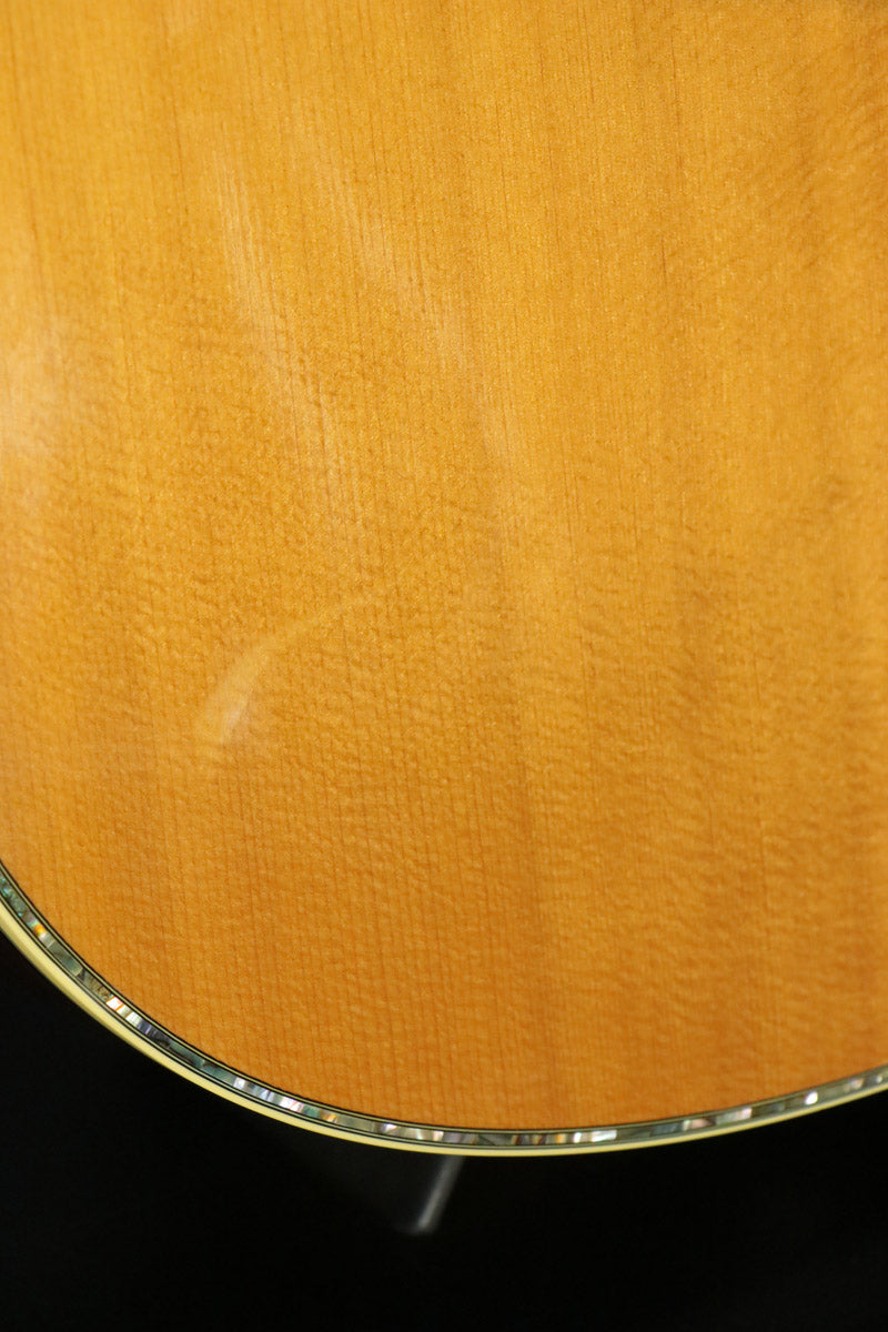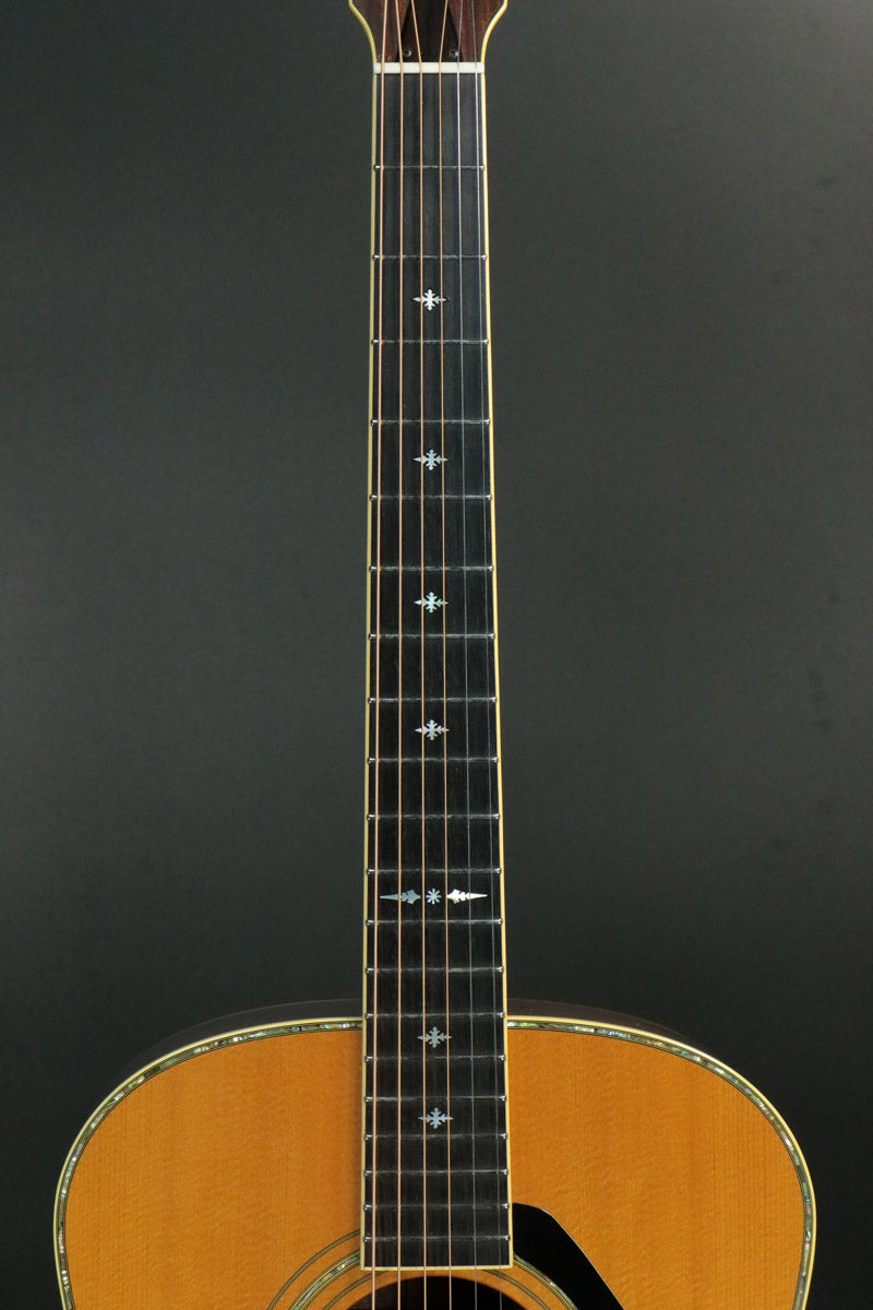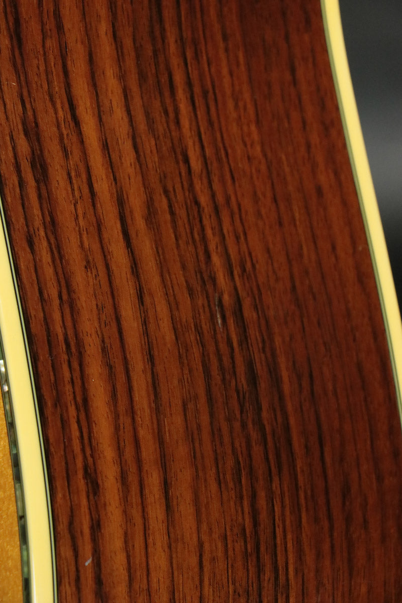 ボディはソリッドスプルースTOPにソリッドローズウッドSIDE/BACKのオリジナルジャンボタイプ、薄いグリップに仕上げたマホガニーネック、エボニー指板/ブリッジ、ロゼッタや外周など各トリムにアバロンを採用し高級感を引き立てております。ボディ内のスキャロップドXブレイシングは、6弦側で太く、1弦側で薄く仕上げた非対称の形状となっており、低音は豊かで高温はよりきらびやかに鳴るように開発された完全オリジナル設計となっております。