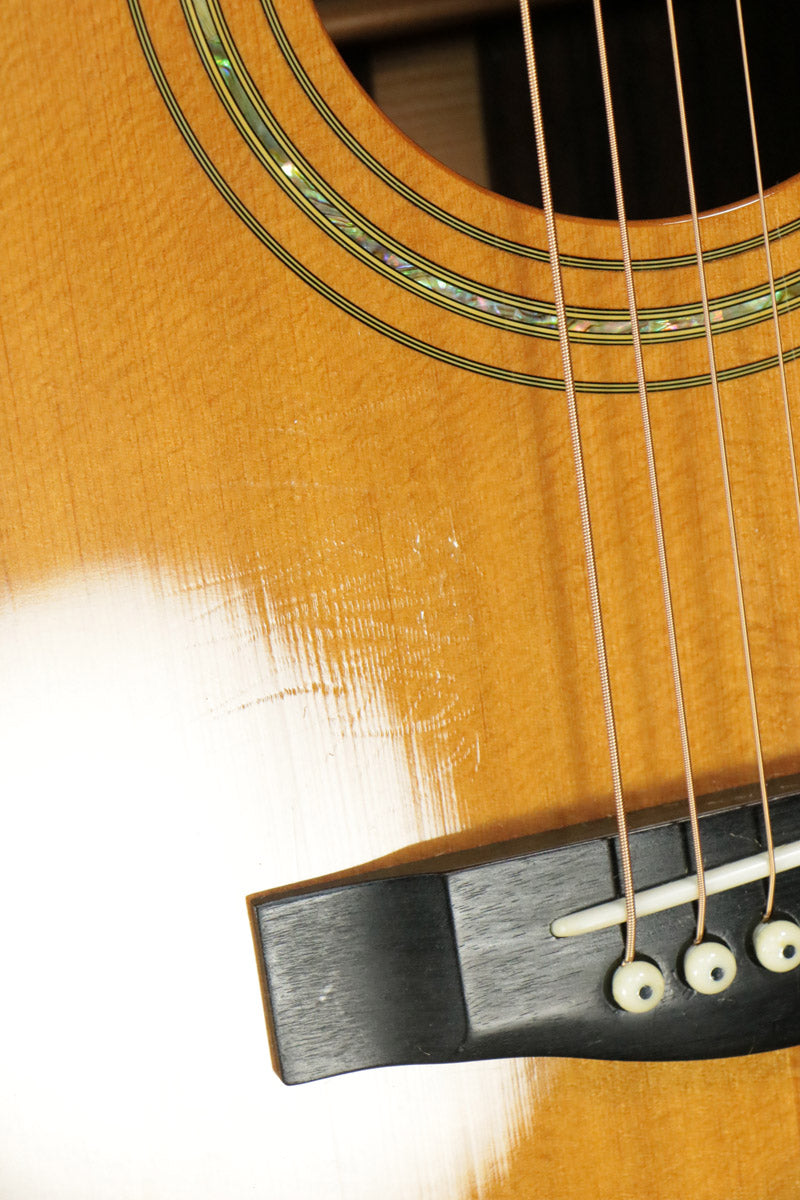A strap pin has been added at the neck joint since its arrival. The end pin holes have been filled in. As for the exterior, there are scratches and dents that show signs of use. There are some cracks on the body side of the first string.