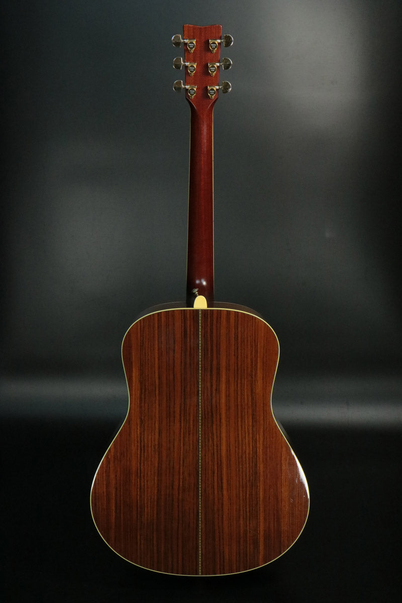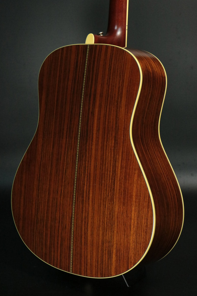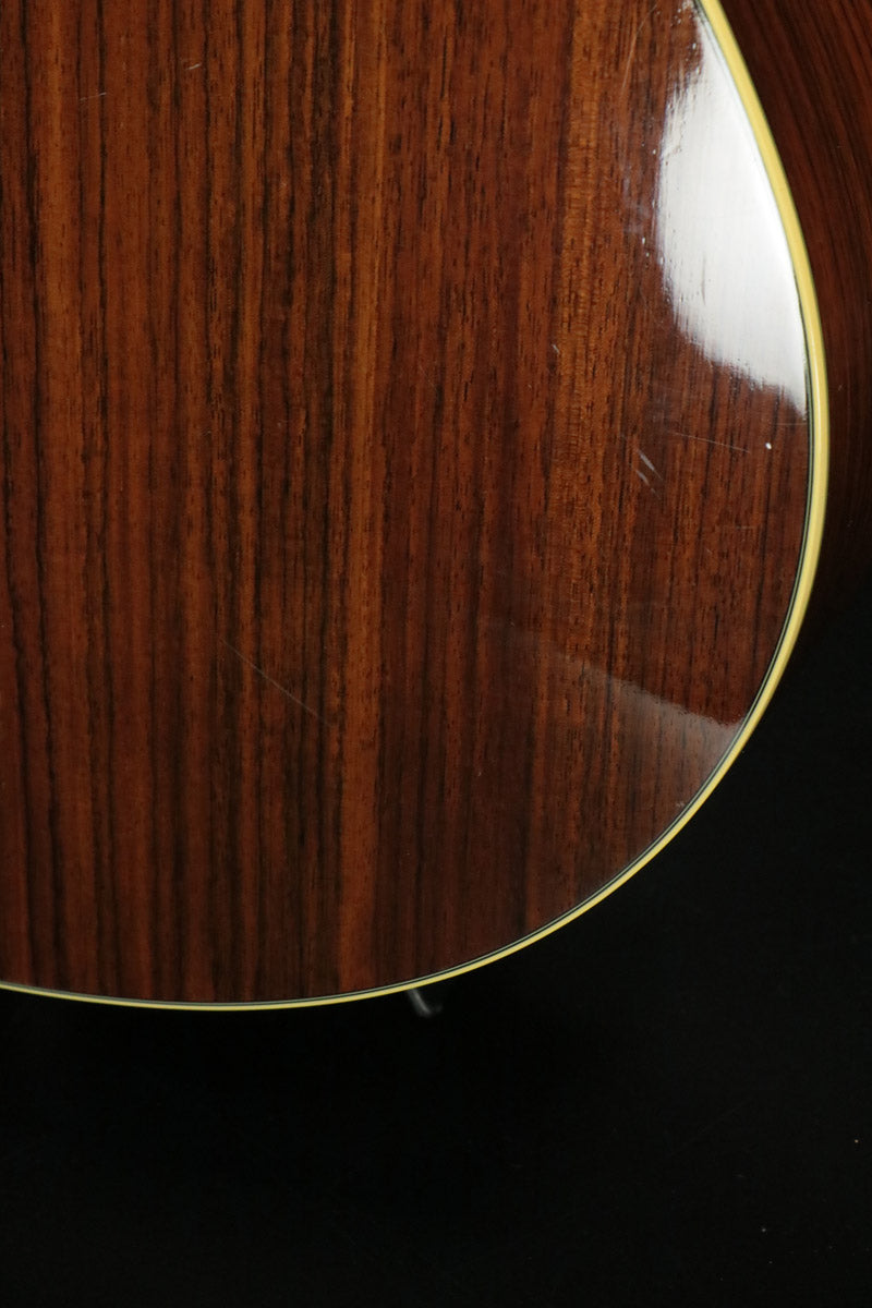 The body is the original jumbo type with solid spruce top and solid rosewood SIDE/BACK, mahogany neck with thin grip, ebony fingerboard/bridge, and Avalon on the rosette and outer trim to enhance the high-class feel. The scalloped X bracing inside the body is asymmetrical, thicker on the 6th string side and thinner on the 1st string side, and is a completely original design developed to make the bass richer and the high temperatures more sparkling.