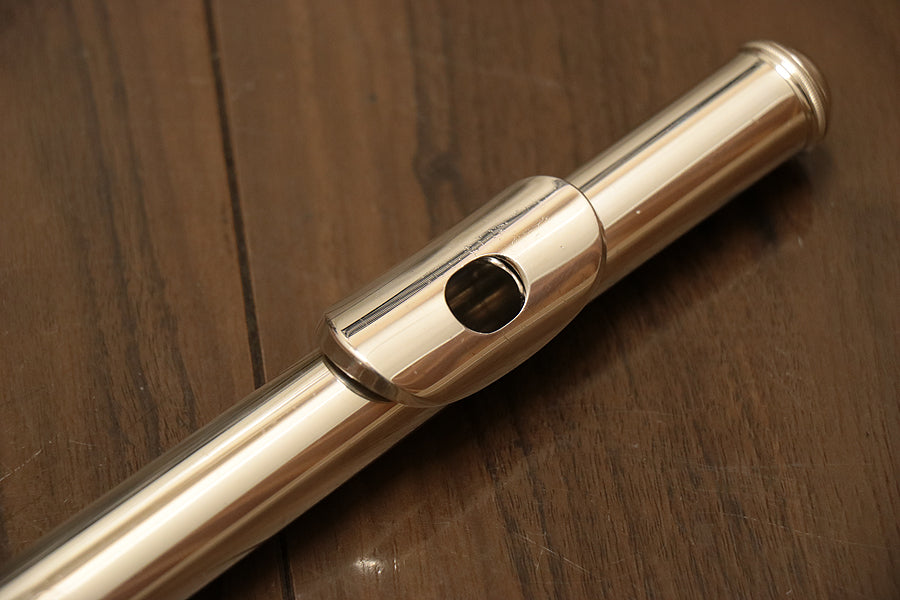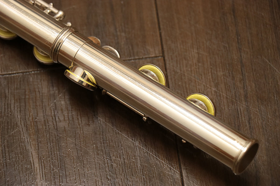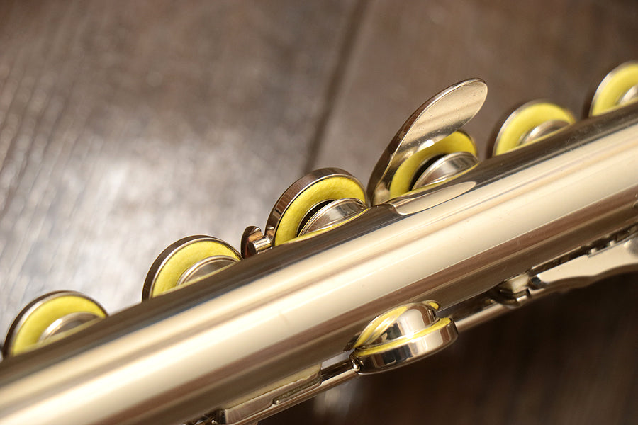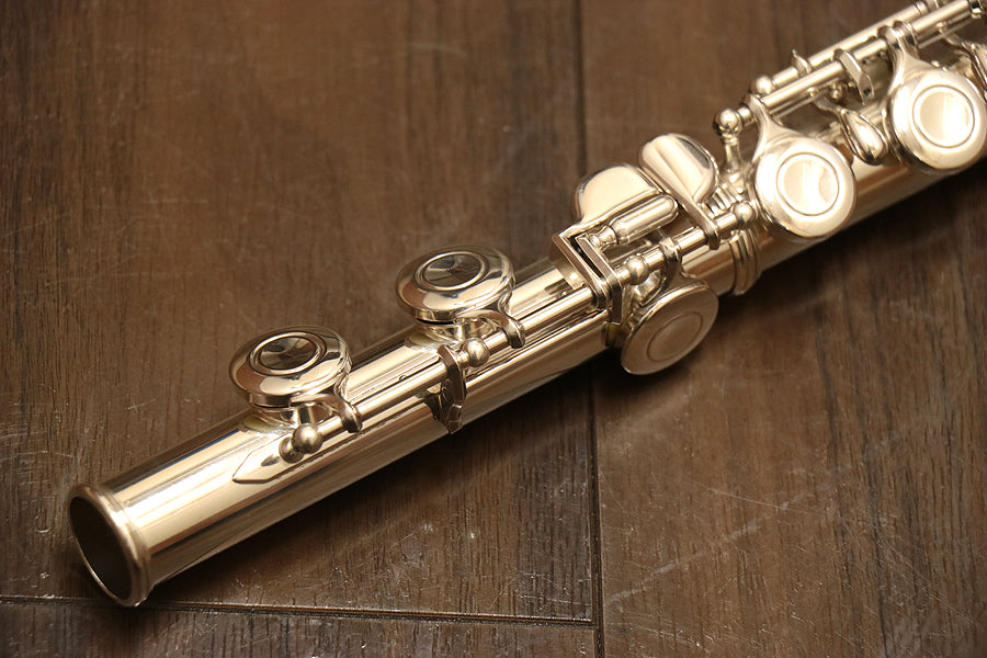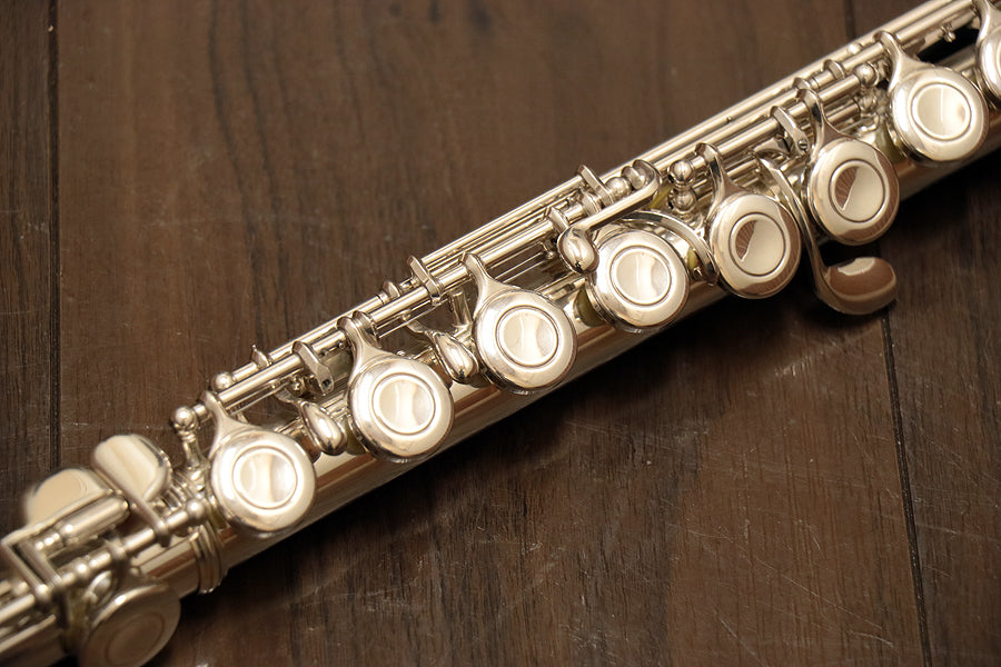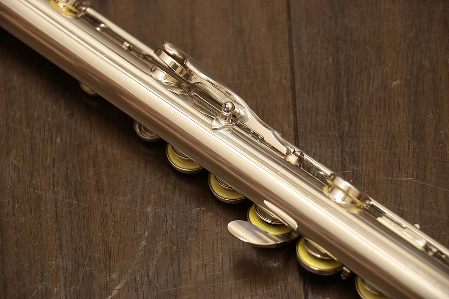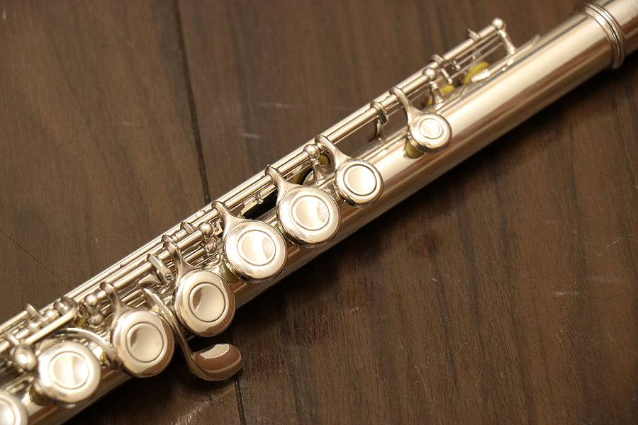 1990年代に製造されていた頭部管銀製・管体銀製・キィメカニズムは洋銀製銀メッキ仕上げのフルート。カバードキィ・Eメカ付き・C足部管といったスタンダードな仕様のモデルです。ビギナーの方でも鳴らしやすく、これからフルートを始めたい方にもオススメです。全体的に使用キズ、頭部管から管体に凹み修正跡が見られます。全タンポ交換を含む全体調整済み。