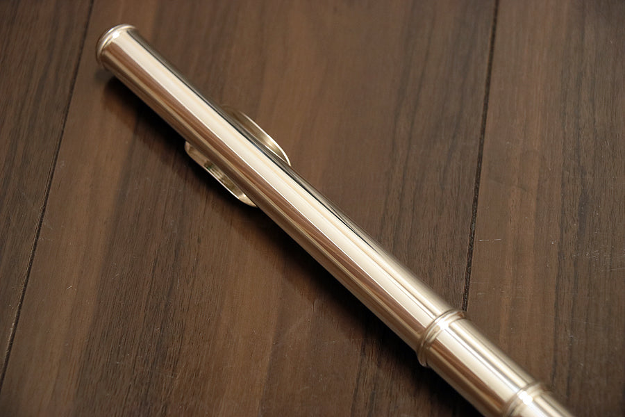 This flute was manufactured in the 1990s and has a silver head tube, silver body, and silver-plated key mechanism. It is a standard model with a covered key, E mechanism, and C foot tube. It is easy to play even for beginners and recommended for those who want to start playing the flute. There are some scratches and dents on the head pipe and the body of the flute. Overall adjustment has been done including replacement of all tampos.