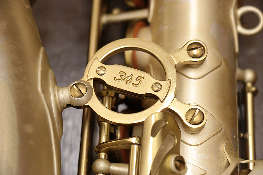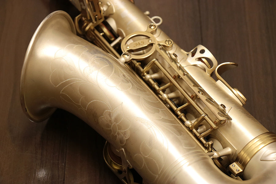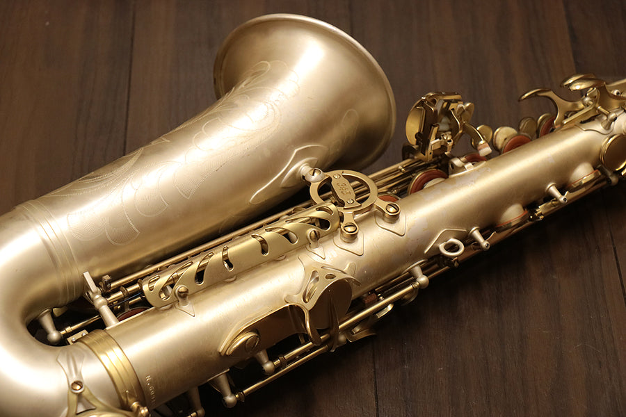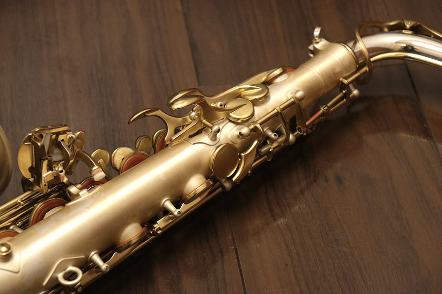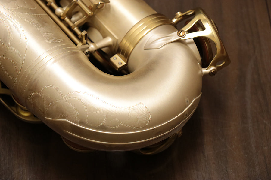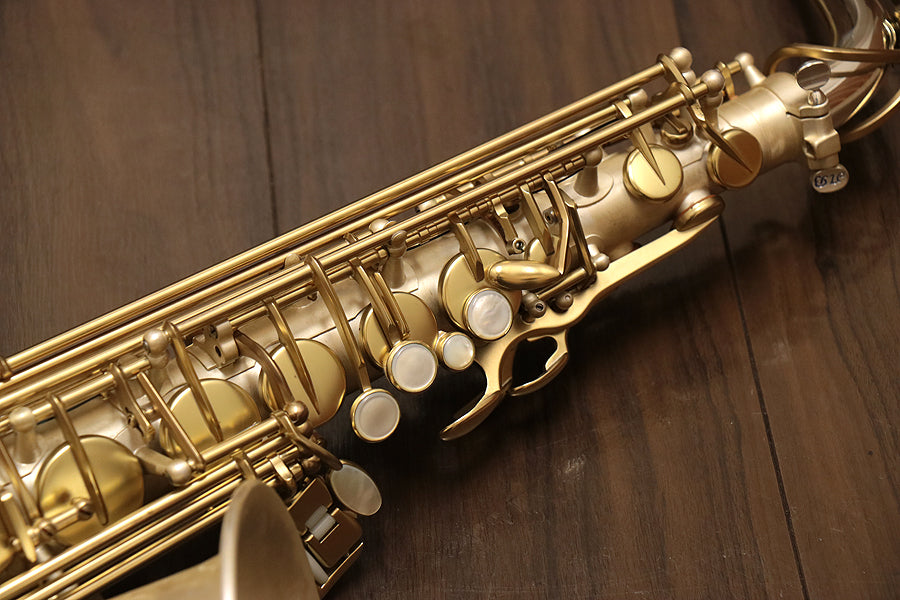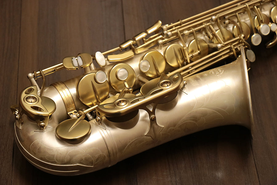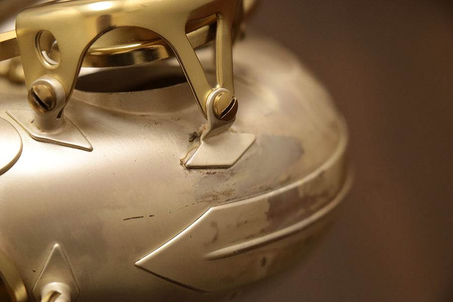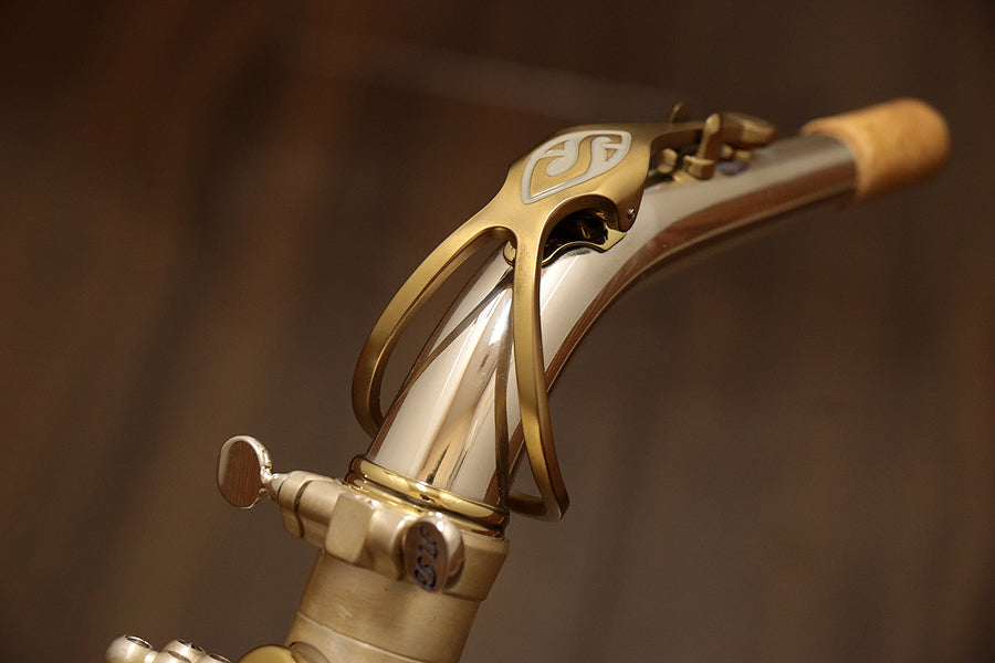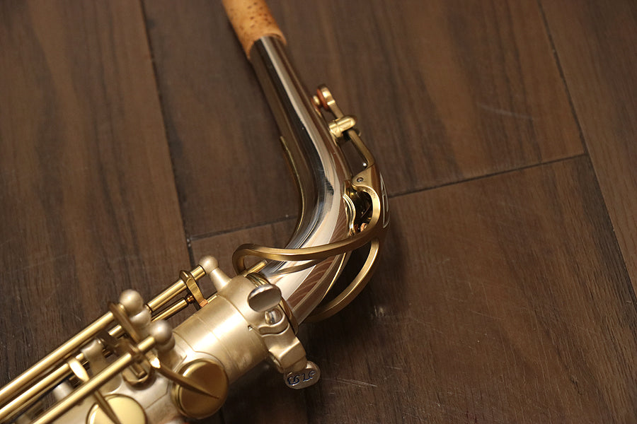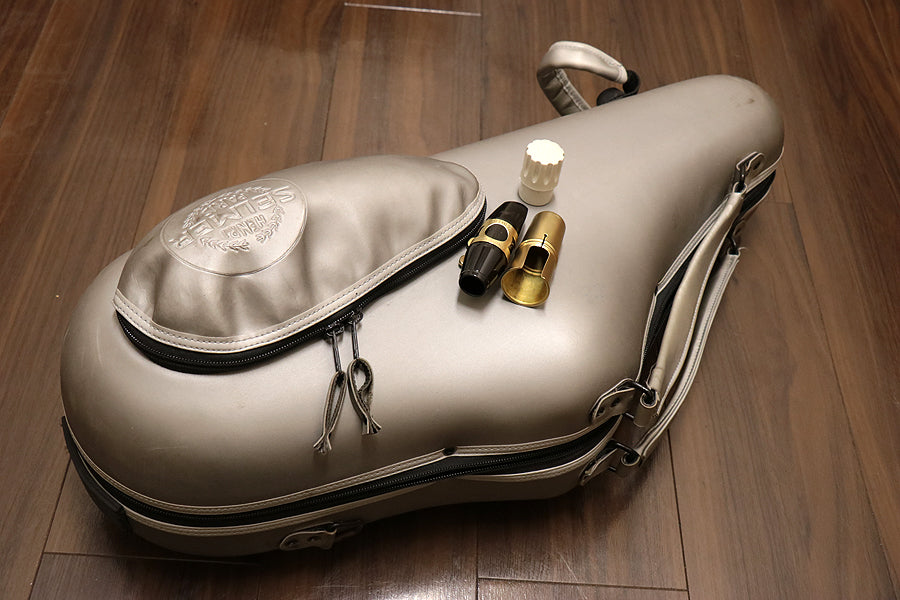 伝統あるセルマーサウンドを受け継ぎながら、キィ配列・重量バランスなどを一新し、新たな可能性を見出したセルマーのシリーズ3。こちらはセルマーが2000年に世界474本限定発売したミレニアムモデル。ネックはスターリングシルバー製ラッカー仕上げ。管体はサテンシルバープレート。キィパーツはサテンラッカー仕上げ。ネックジョイント・ライヤースクリューはシルバープレートと上品で特別感のある仕様です。全体的に使用キズや変色が見られます。LowCキィガードも凹み修正跡、ハンダ修復跡が見られます。管体が全体的に黄色っぽく見えていますが、表面に変色防止のラッカーがかけられ、それが剥がれてきているようにも見えます。純正のフライテックケース、純正エンドプラグ、純正リガチャー・キャップも付属。