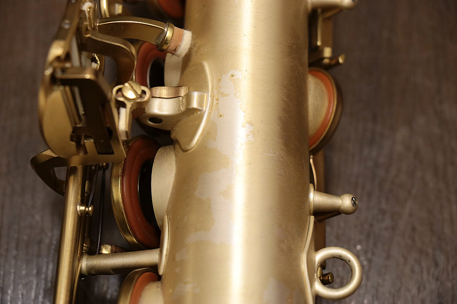 コンディション:全体的に使用キズや変色が見られます。LowCキィガードも凹み修正跡、ハンダ修復跡が見られます。管体が全体的に黄色っぽく見えていますが、表面に変色防止のラッカーがかけられ、それが剥がれてきているようにも見えます。
