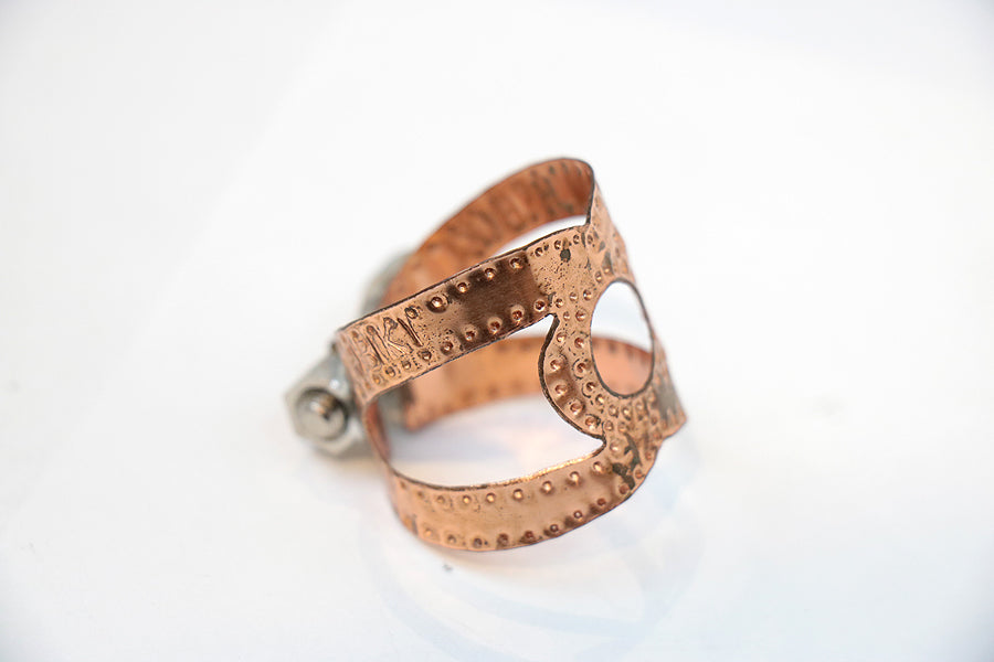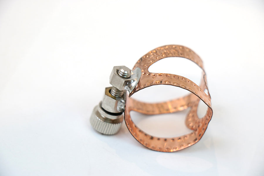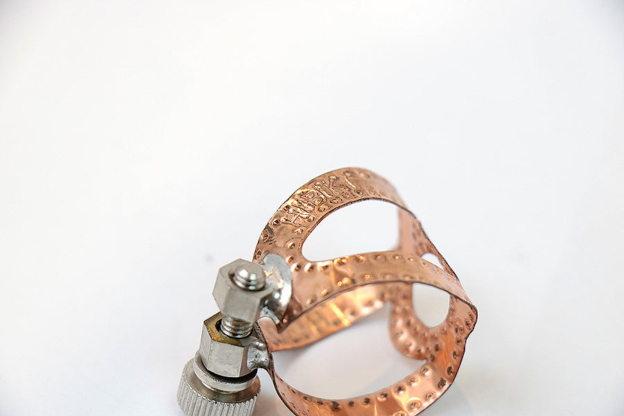 Handmade ligature by saxophonist Yuwa Hayashida. Reverse-tightened ligature fits Selmer S80 and other soprano saxophones. Made of bronze.