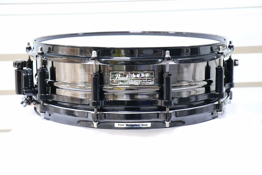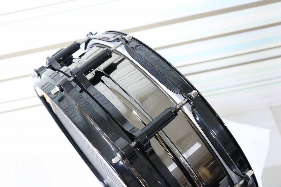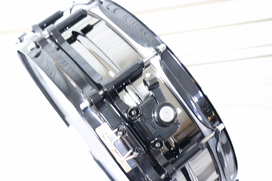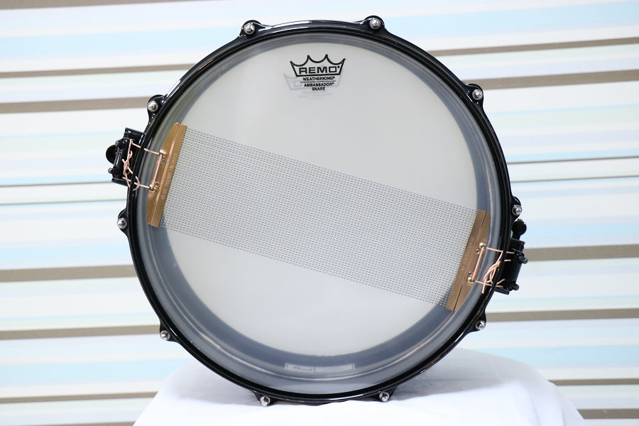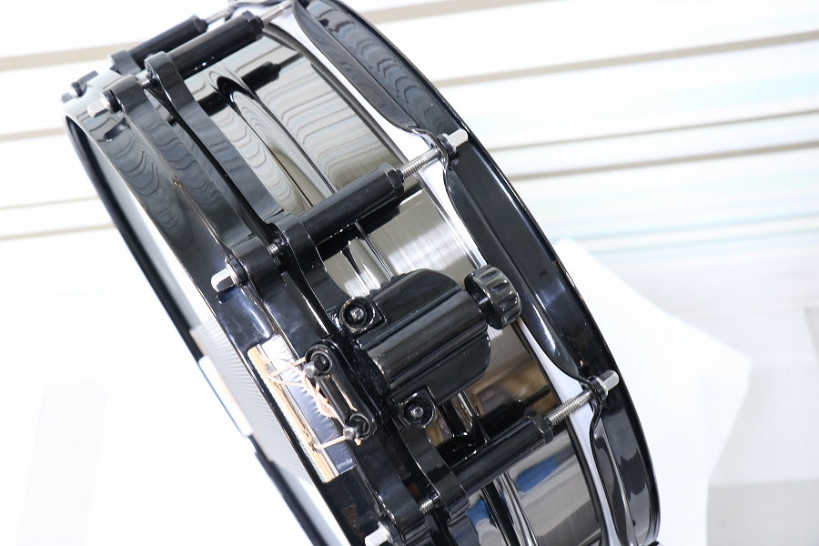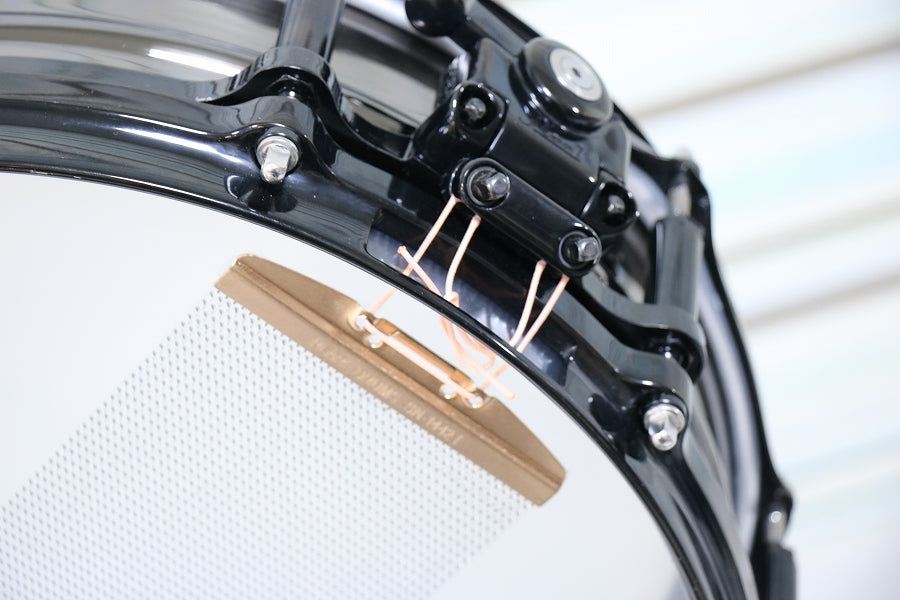 ブラックニッケルメッキを施した1.5mm厚のビード付ブラスシェルをフリーフローティングに組み込み、上下のフープをあえて異なる種類にするなど細部にまでこだわり、そのシャープでパワフルなサウンドは、Tetsuの豪快な驚速ドラミングによく似合います。