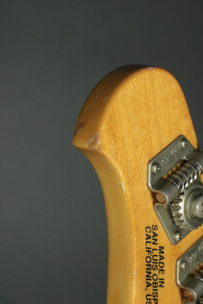 外観としましては、全体的に塗装割れを伴う打痕、擦れ傷、金属パーツの経年によるくすみといった、使用感・ダメージがが見られます。ヘッドには塗装欠けを伴う傷が見られます。ネックグリップには使用による細かな傷、外観上の黒ずみが見られます。フレット上には使用によるヘコミも見られますが、現状引っかかりや音詰まりを感じる箇所はございません。ピックガード上には弾き傷や一部塗装欠けが見られます。ボディには全体に傷、塗装割れを伴う打痕の使用感が見られます。