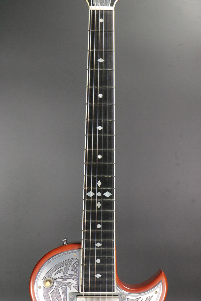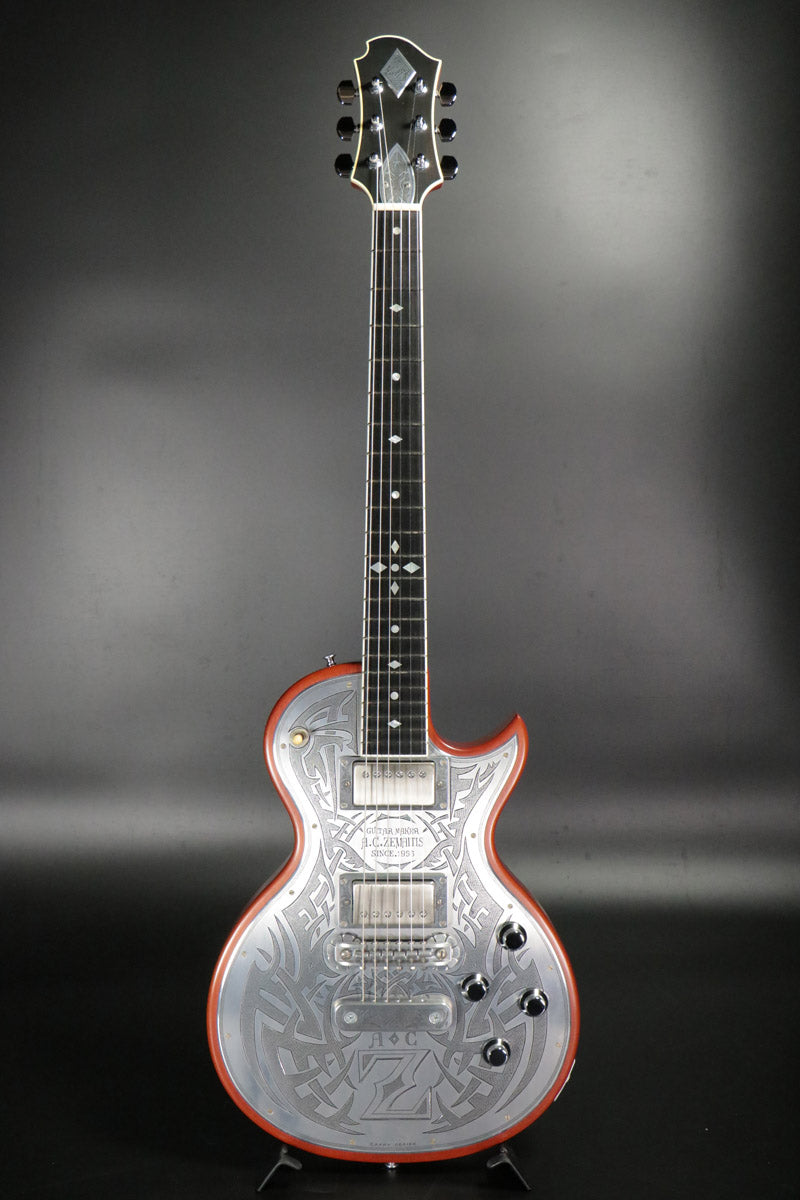 Zemaitisの設立者Tony Zemaitisの意思を引き継いだクラフトマンによって、数量限定で製作されるZemaitis Custom Shop。その中でも厳選された木材を使用し製作本数も極めて少ない究極のZemaitisとも称されるTony's Collectionの個体です。トライバルと呼ばれる紋様のイングレイブがボディTOPのプレートに描かれているメタル・フロント。初期のハンドメイドに近い形で生産された時期のモデルで、ホンジュラスマホガニー3Pボディ、ホンジュラスマホガニーネック、指板材にはエボニーを採用。ピックアップにはディマジオ製が搭載された、近年の上位機種と比べてもよりオリジナルに近い仕様で生産されています。