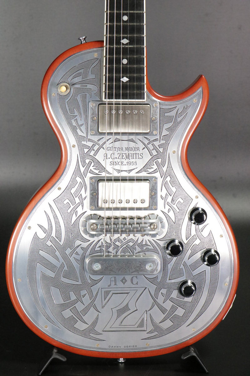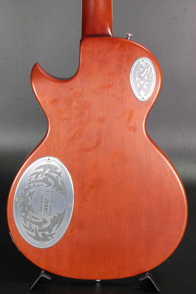 Zemaitis Custom Shop is a limited edition of Zemaitis Custom Shop, which is made by craftsmen who inherited the will of Tony Zemaitis, the founder of Zemaitis. It is an individual of Tony's Collection. The metal front with tribal ingrave pattern on the top plate of the body. This model is from the early period of near handmade production, with Honduran mahogany 3P body, Honduran mahogany neck, and ebony fretboard material. The pickups are made by DiMaggio, and the specifications of this model are closer to the original than those of the higher-end models produced in recent years.