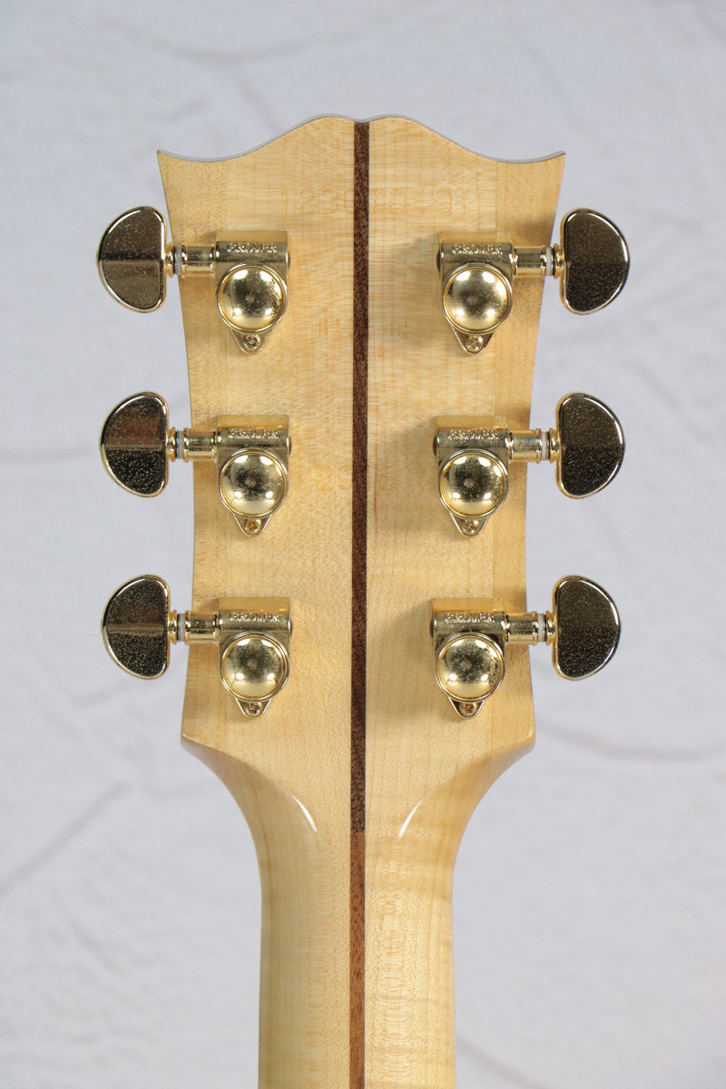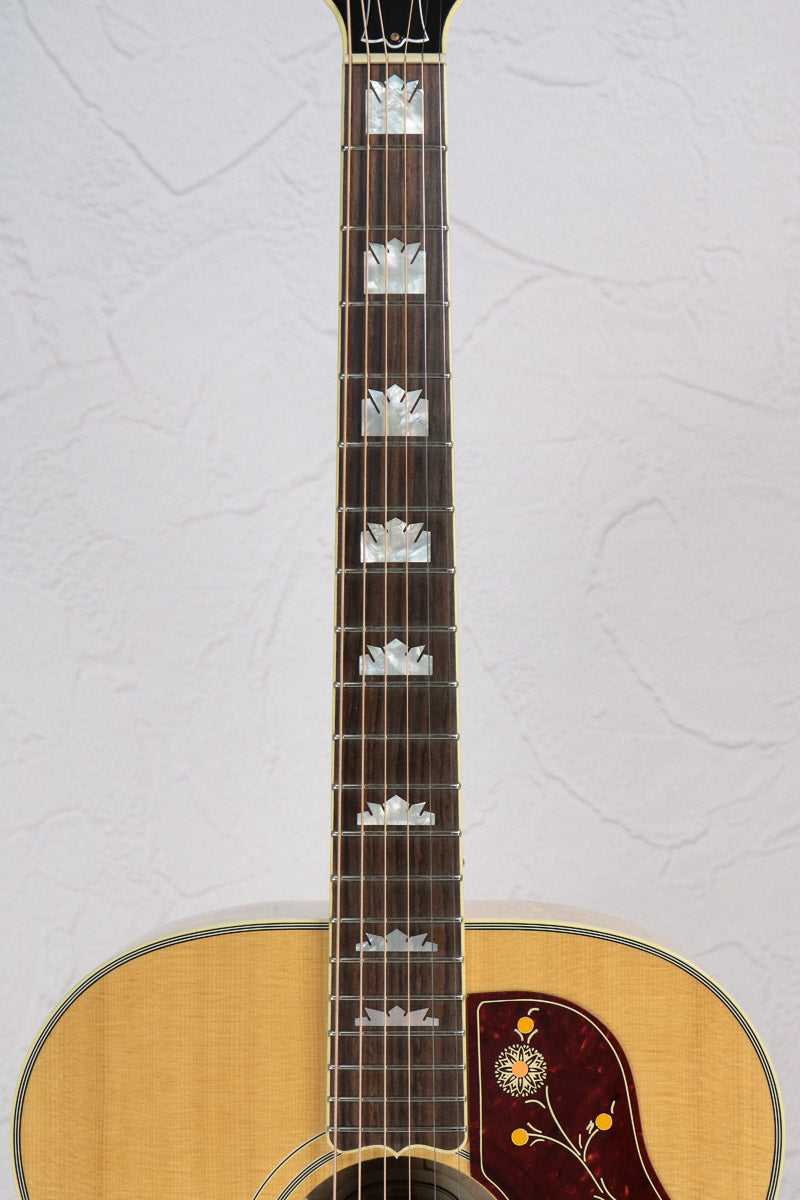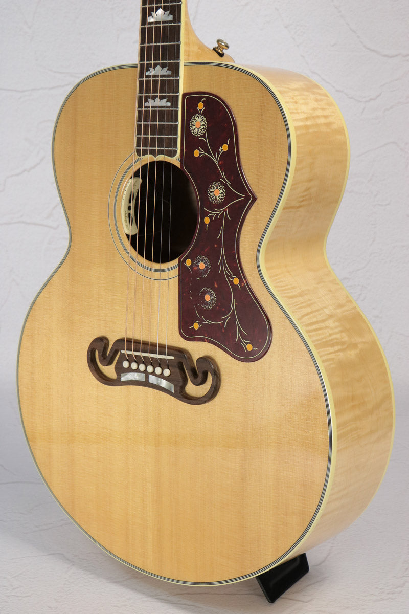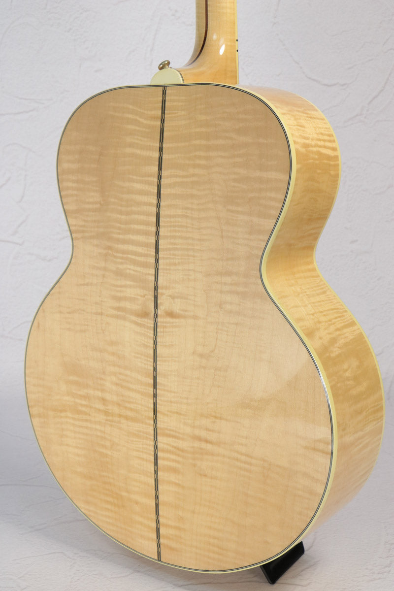 This model is well known as a Super Jumbo, also known as the King of Flat Top. The body top is made of Sitka spruce and the side backs are made of maple, with a 2-piece maple neck, rose fingerboard, approximately 43mm nut width, and 25.5inc scale. The jumbo size of this model is well known for its bass resonance and the pleasant sound of the maple wood. The ANTHEM dual pickup system from L.R. Baggs offers a wide range of sound-making possibilities, with the ability to blend piezo pickups and condenser mics. The blend can be adjusted as desired, making it suitable for a wide variety of musical genres. The powerful, thick-boned sound of the "Jumbo" is truly worthy of its name!