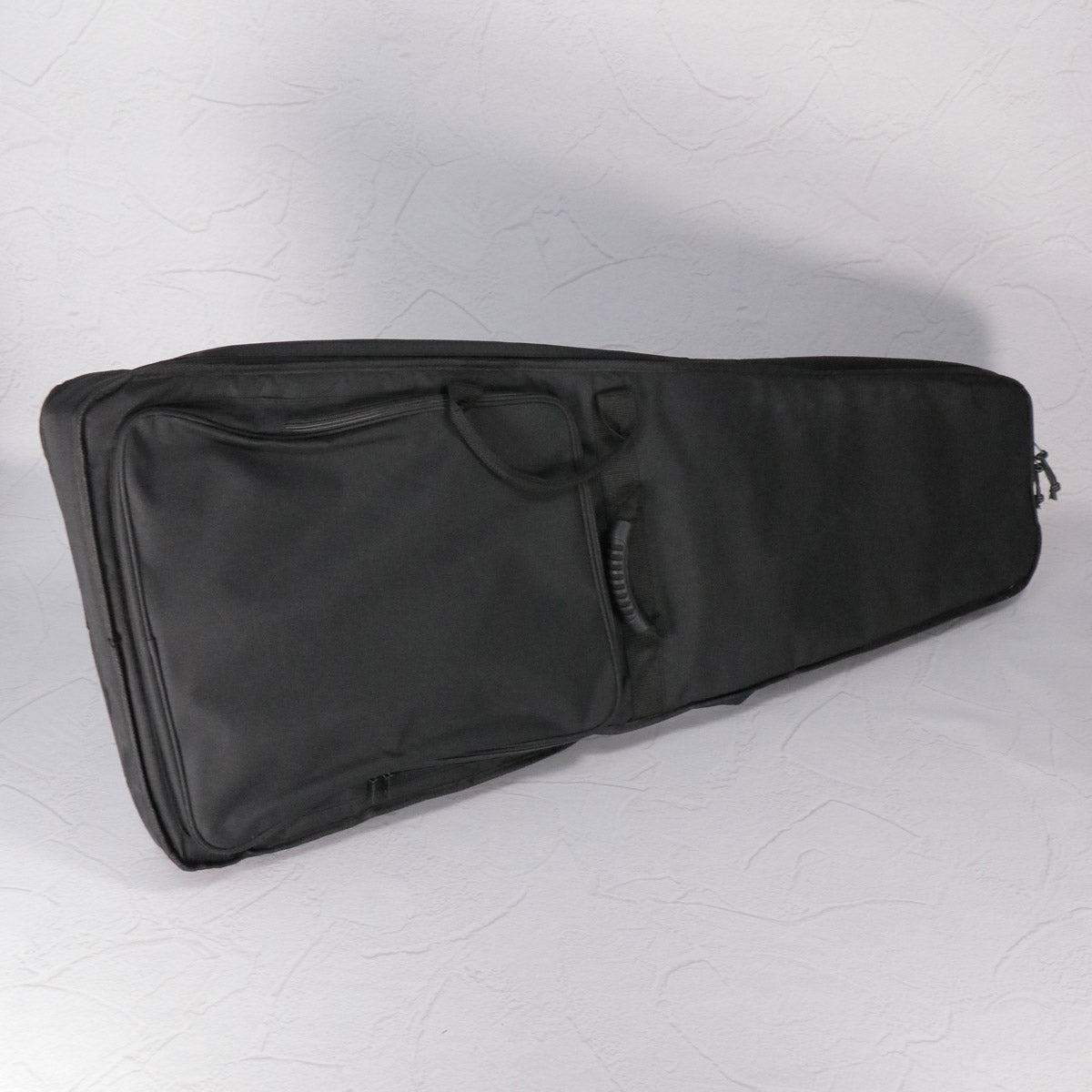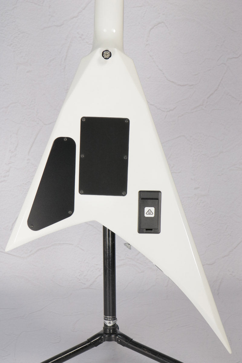 From the X Series, this one features a maple fingerboard, a rarity for a Jackson Randy V. The aggressive reverse head design features a through-neck construction with graphite-reinforced 1-piece maple, and basswood is used for the body wings. The maple fingerboard with black reverse shark fin inlay is compound radius and can be played comfortably in any position. Seymour Duncan AHB-1b (rear) and AHB-1n (front) humbucking active pickups are mounted, and a Floyd Rose Special double locking tremolo is equipped.