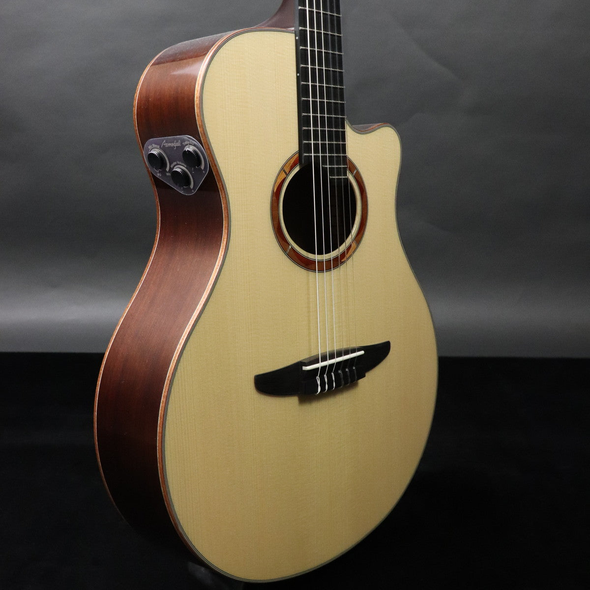 アンダーサドルピックアップで弦の振動を、表板裏面のコンタクトセンサーピックアップで表板の鳴りを、ボディ内部に装着されたマイクでギター胴内の空気感をそれぞれ集音します。3つの音を組み合わせることで、幅広いダイナミクスとプレイヤーの繊細な指の感触に応え、自然なナイロン弦サウンドをラインアウトします。