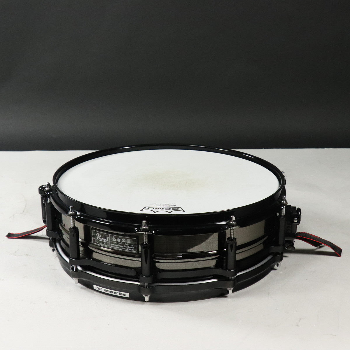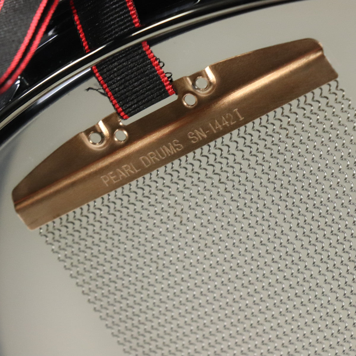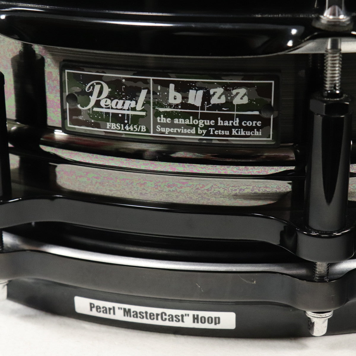 D'ERLANGERのドラマー、Tetsuが監修したメタルスネア「buzz」シリーズのPearl FBS1445/B。1.5mm厚のブラックニッケル仕上げのブラスシェルとフリーフローティング構造が、シェル本来の豊かな響きを余すことなく引き出します。