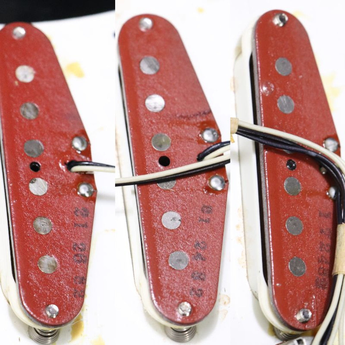 ネックプレートは交換されているためシリアル自体は不明ですが、内部に残されたスタンプから製造時期を判断。フロントピックアップには「21 26 82」、センターに「21 24 82」、リアに「17 24 82」といった刻印が確認でき、いずれも1982年6月頃に製造されたオリジナルのレッドボビン・ピックアップであることが分かります。さらにネックジョイント部には「7-10-82」の記載が残されており、同年7月に組み上げられたことを示す記録として信頼性を高めています。