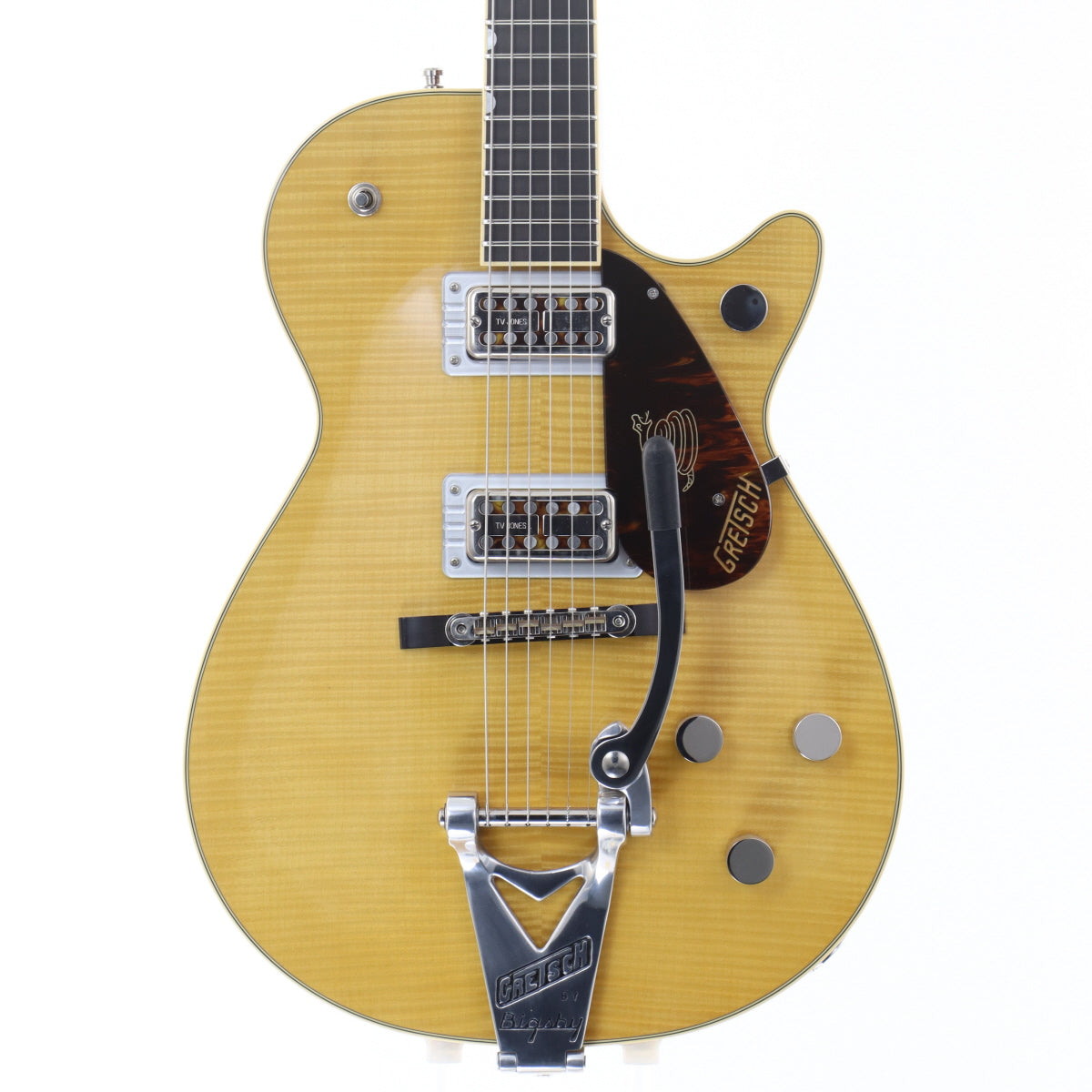 GRETSCH G6130T Limited Edition Sidewinderは、美しいアーチド・フレイム・メイプル・トップとチェンバード・マホガニーバックを採用した限定モデル。TV Jonesカスタム・ハムバッカーがクリアで抜けの良い音色を実現し、Bigsby B3PテイルピースとAdjusto-Maticブリッジの組み合わせで豊かなビブラート表現も可能です。Amberカラーのニトロセルロース・ラッカー仕上げは木目の美しさを際立たせ、ステージ上でも映える一台。演奏性、ルックス、サウンドすべてにこだわったグレッチの魅力を存分に味わえるモデルです。