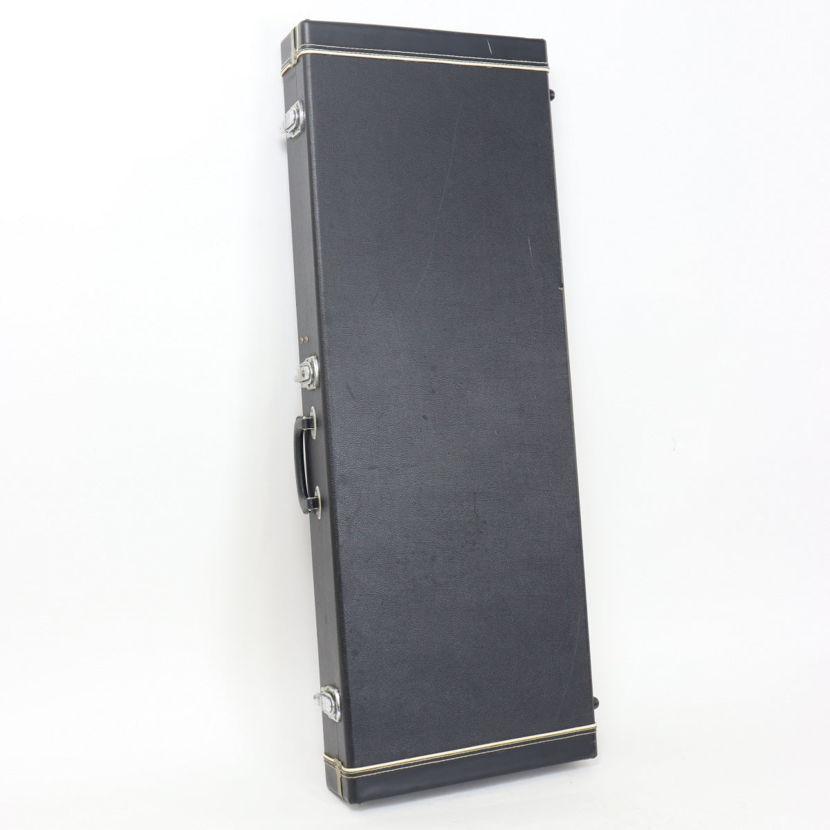 The pickguard has numerous play marks and distortions from age, the control knobs are discolored, and the hardware is dull.