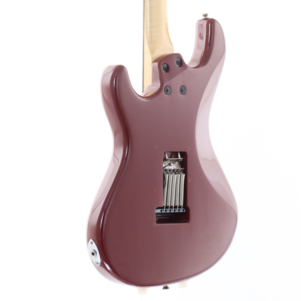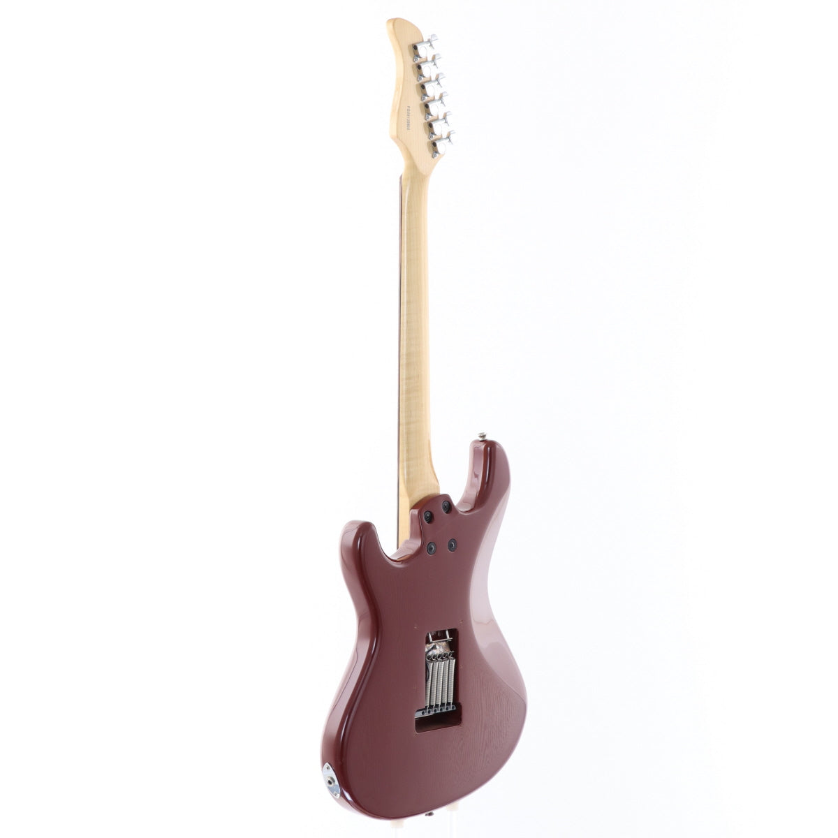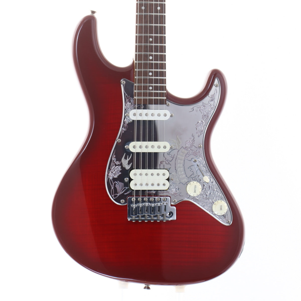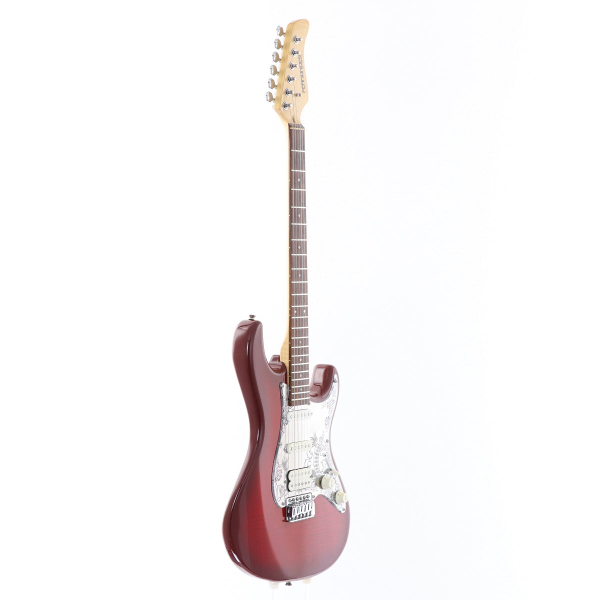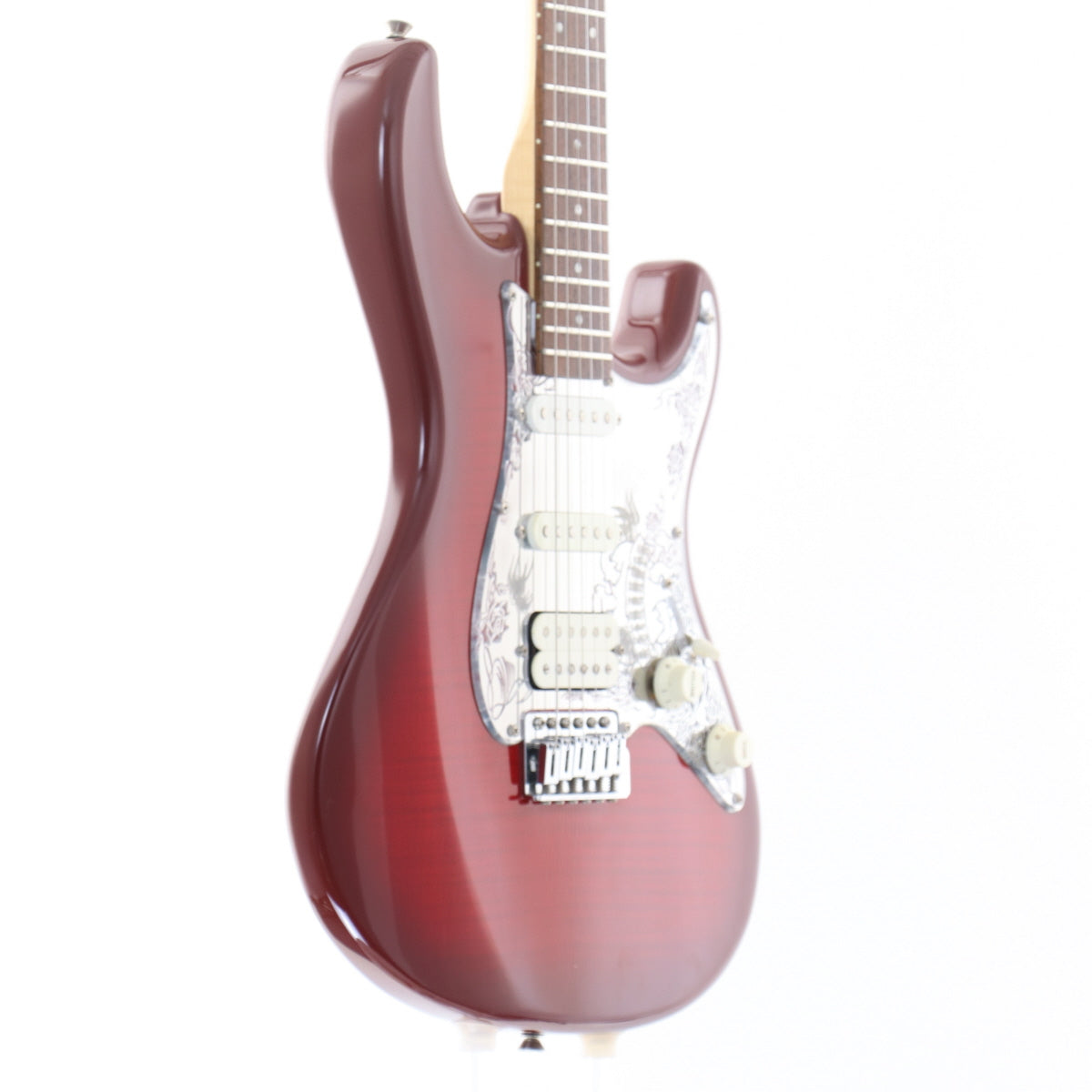 アルダーボディにフレイムメイプルの突板をラミネイトし、レッドバーストにフィニッシュ、メイプルネック/ローズウッド指板の22フレット仕様でロングスケールとなっております。